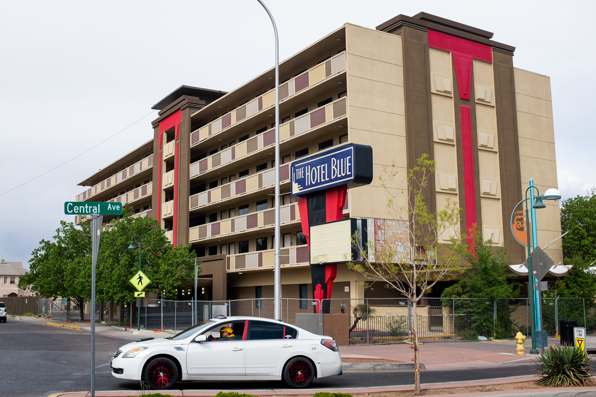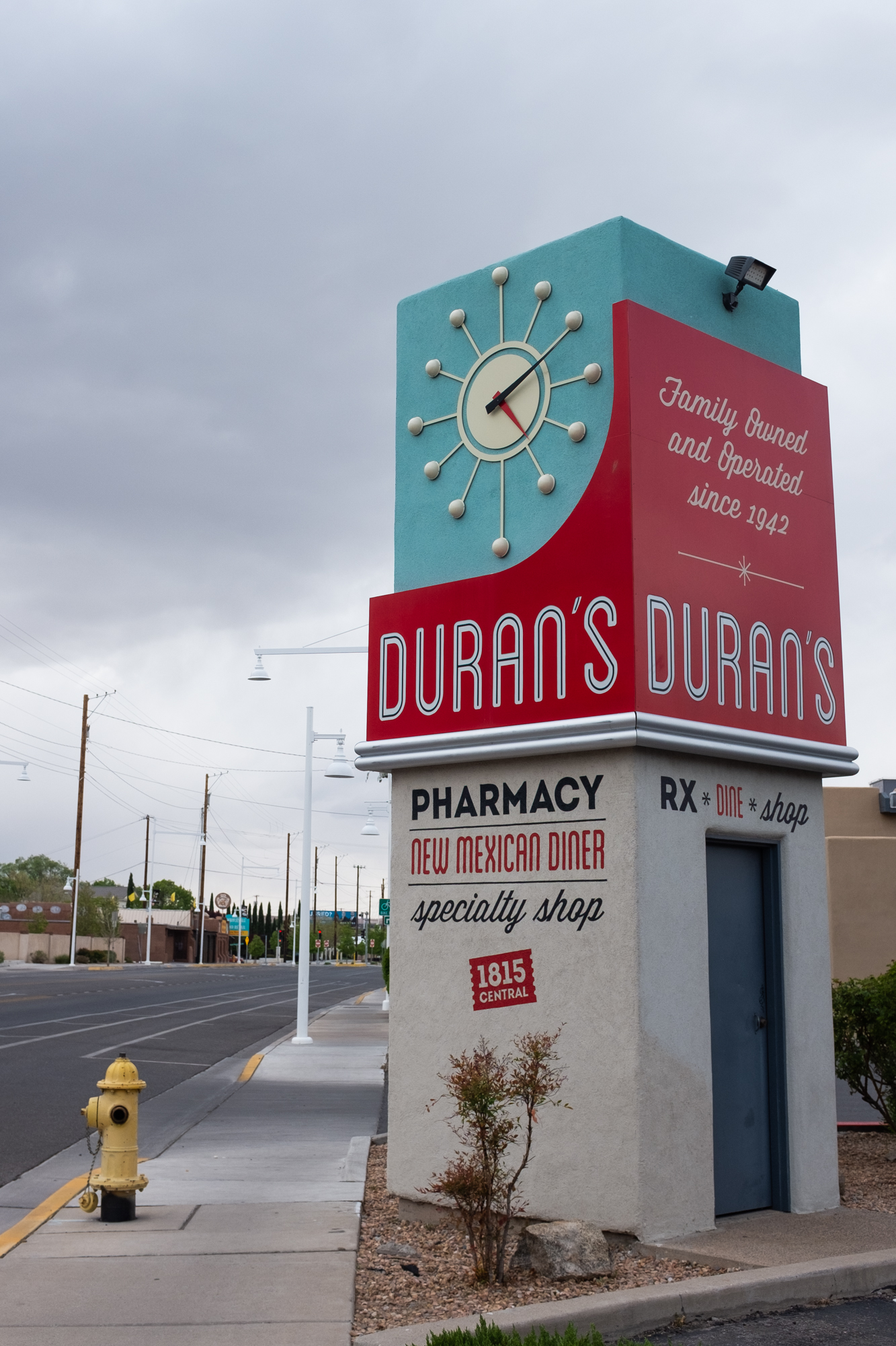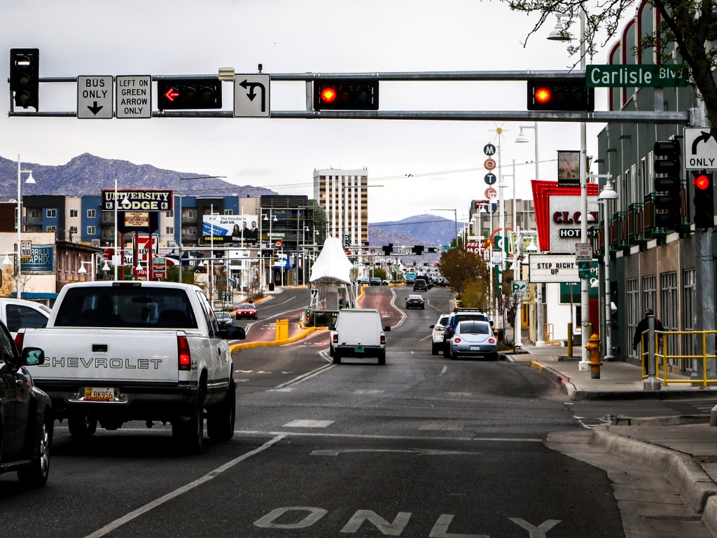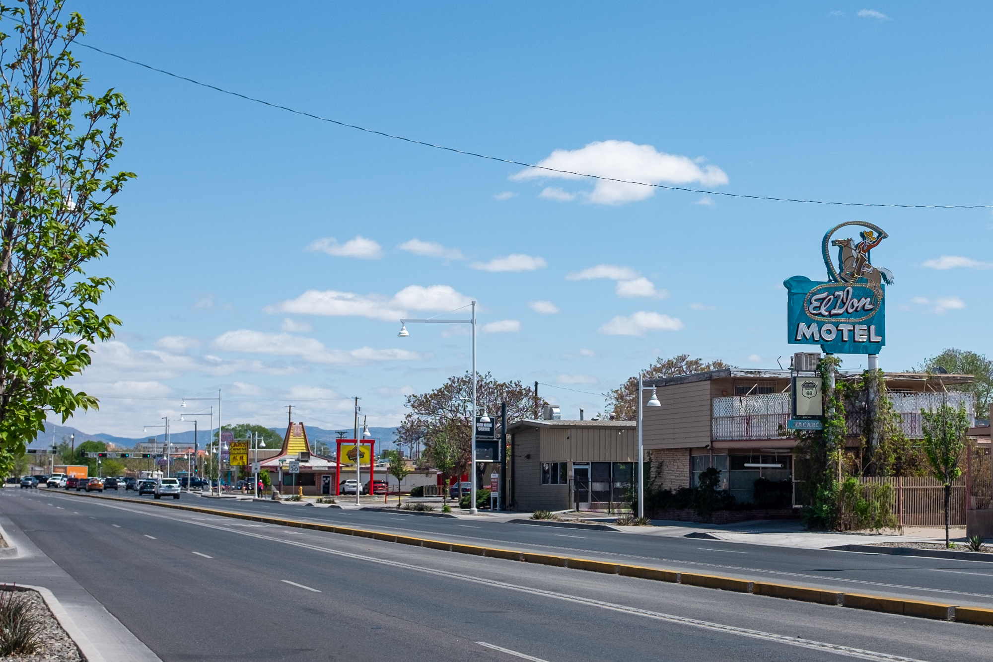 Thus, Route 66 was on my radar once again, and I had an abstract idea to try to recreate the photo. He gave me some help by including the “Carlisle” cross street in the frame, so before dinner I headed out (by car) through the University area to find the shot. I should have brought a longer lens, but some cropping got me pretty close: