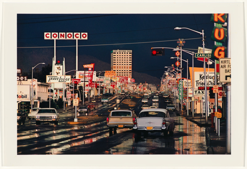 From the caption on the National Gallery of Australia page: “Haas associated black-and-white photography with the horrors of the Second World War and he began to work with colour soon after moving to America in 1951. During the early 1950s, Haas hitchhiked across America, a journey which took him to the country’s Southwest – an area he regularly photographed over the next decades, noting changes taking place through modernisation at highly mythologised sites such as Route 66. Photographing the roadscape after rain, Haas depicts the modern Route 66 as a world of shimmering energy.“