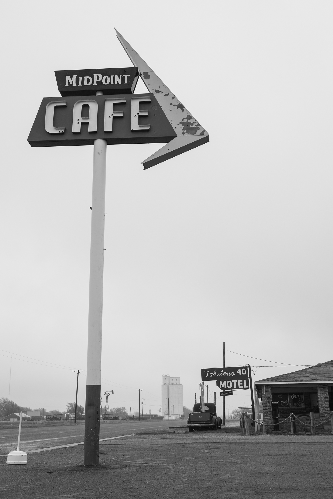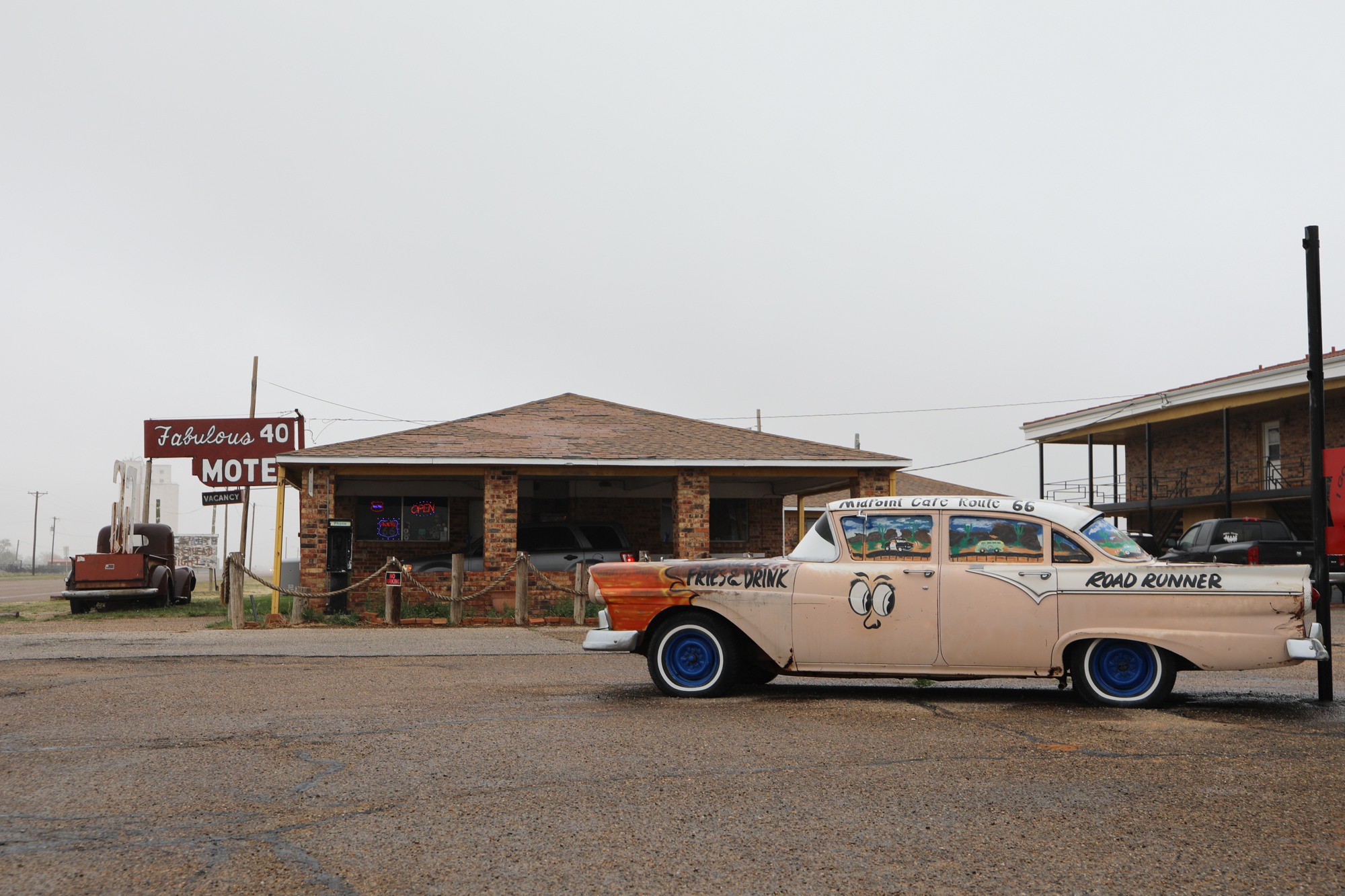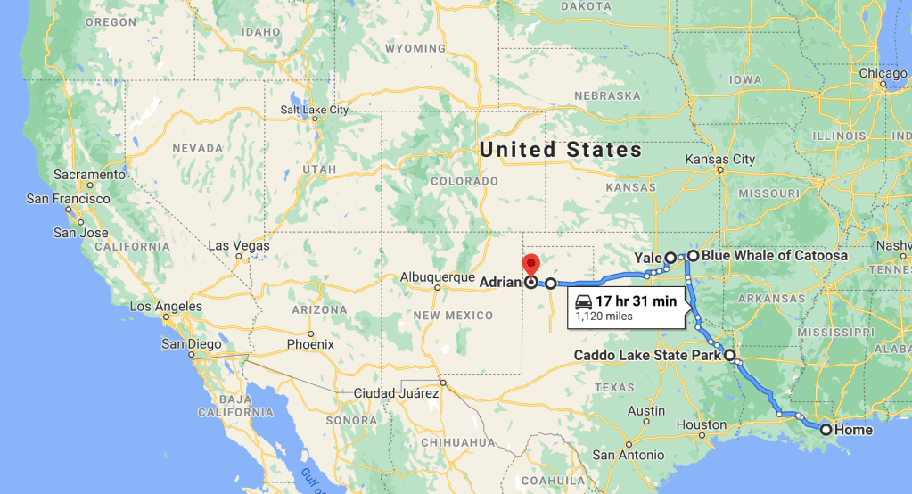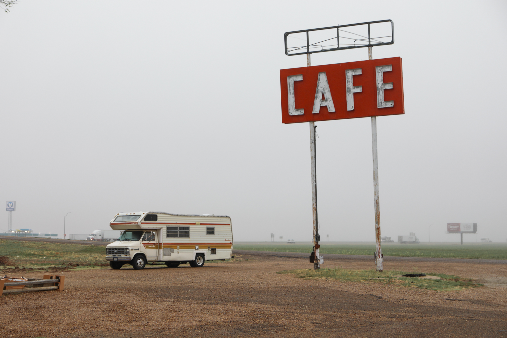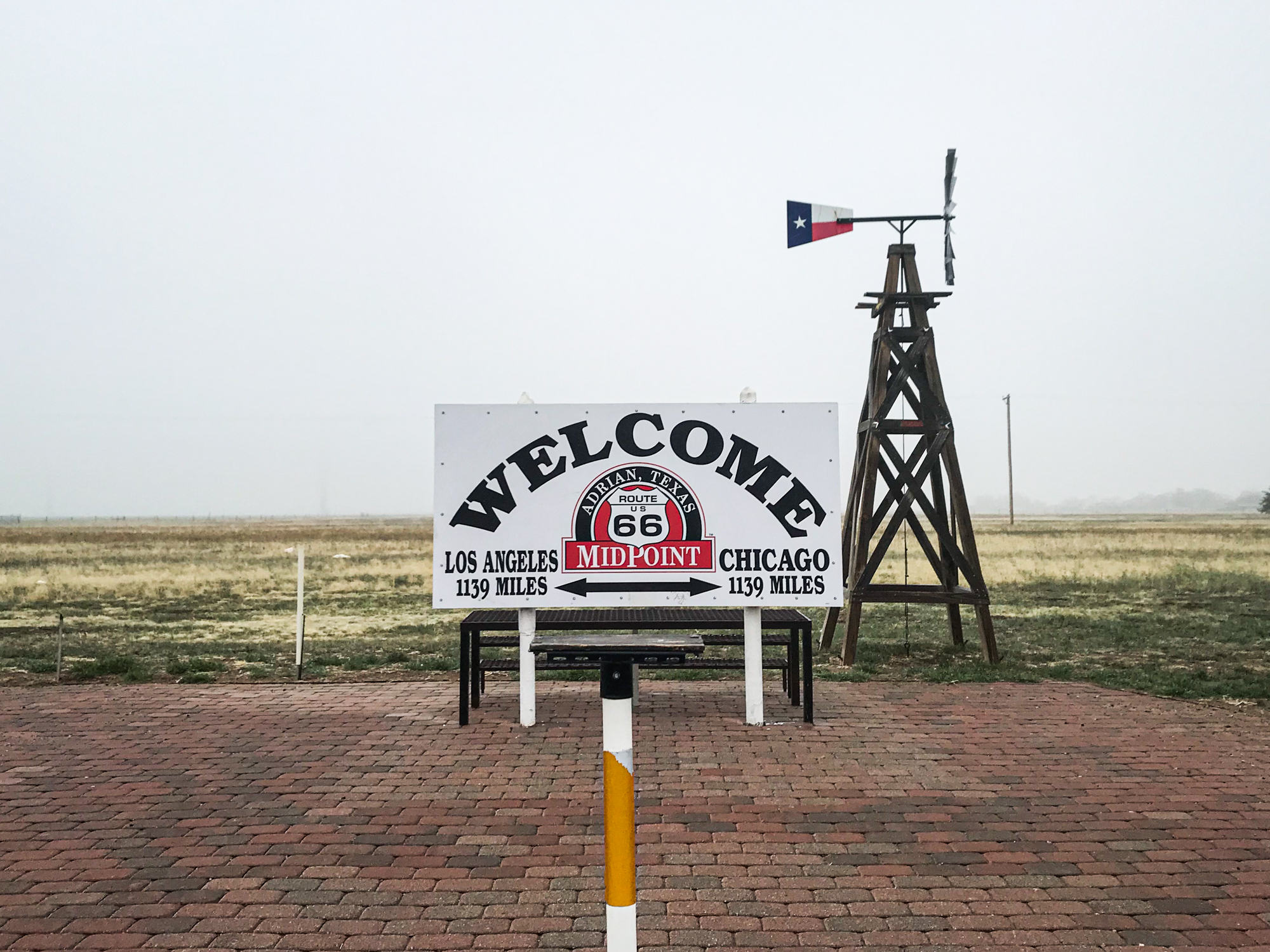 After the luxury of sleeping in a bed two nights in a row it was time to keep moving (Palo Duro Canyon State Park will get its own post). Across the rest of the panhandle I went, enveloped in a spooky mist, making sure to stop in at the famous Midpoint Café in Adrian. I chatted with the waitress for a bit; she said 85% of their business is ordinarily foreigners and they were really eager for the borders to open back up.