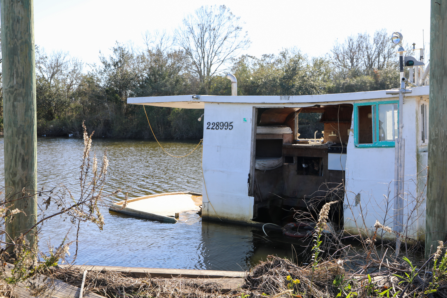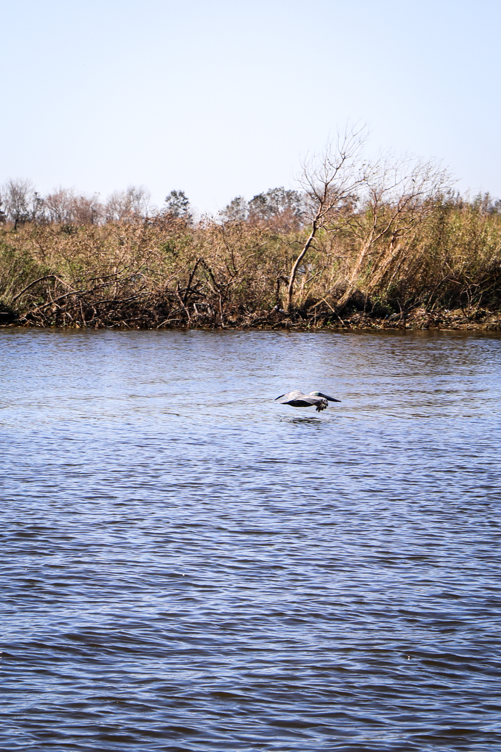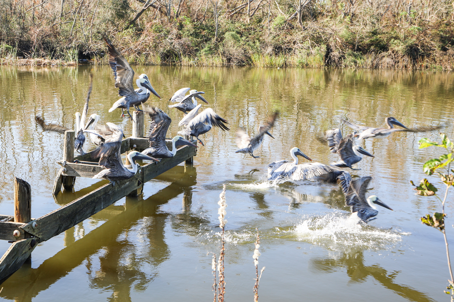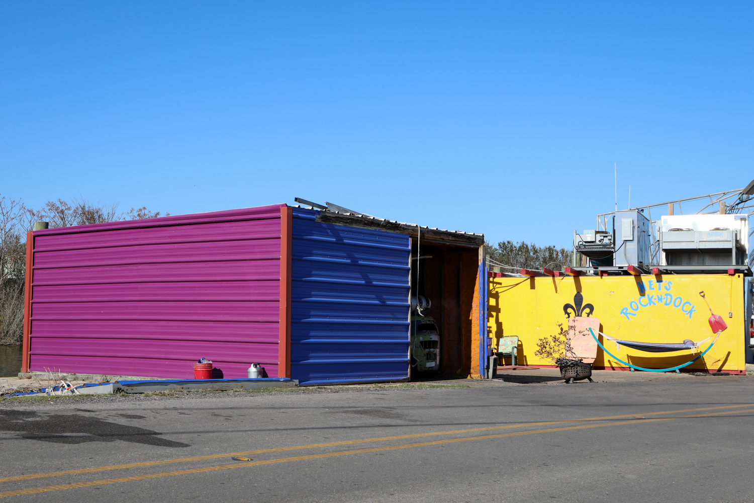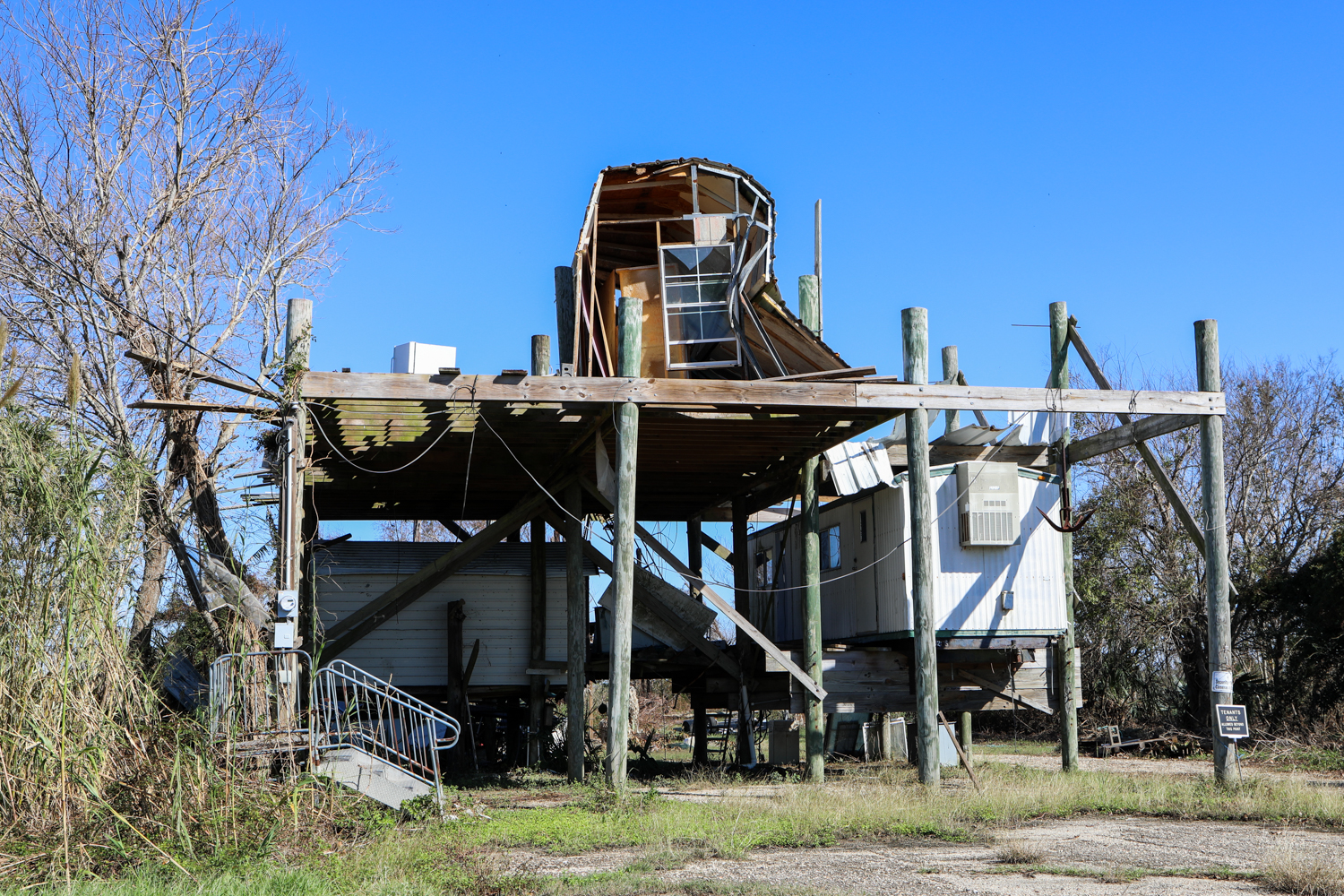 It was, as predicted, an interesting landscape of live oaks, Spanish moss, gnarled cypresses, and reflective waterways. We were treated to appearances by a number of waterbirds, and the photogenic trappings of a sportsman’s life on the bayou. What we were unprepared for were the signs of devastation from, I would assume, Hurricane Zeta (as the other seven named storms to barrel through the Gulf this year miraculously dodged this region). There were at least a dozen– maybe closer to two– upended trailers and RVs splintered along a two-mile stretch of Route 46. The metal roofs of boat slips were curled up on themselves like the lids of sardine tins. The “Baba Yaga houses” (as my friend so enthusiastically identified them throughout the afternoon) on their lofty stilts, so adept at avoiding floodwaters, proved no match for high winds in many cases.