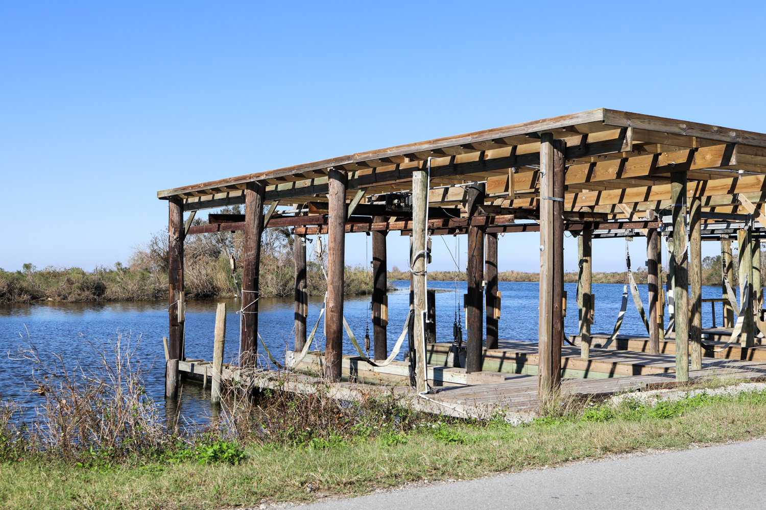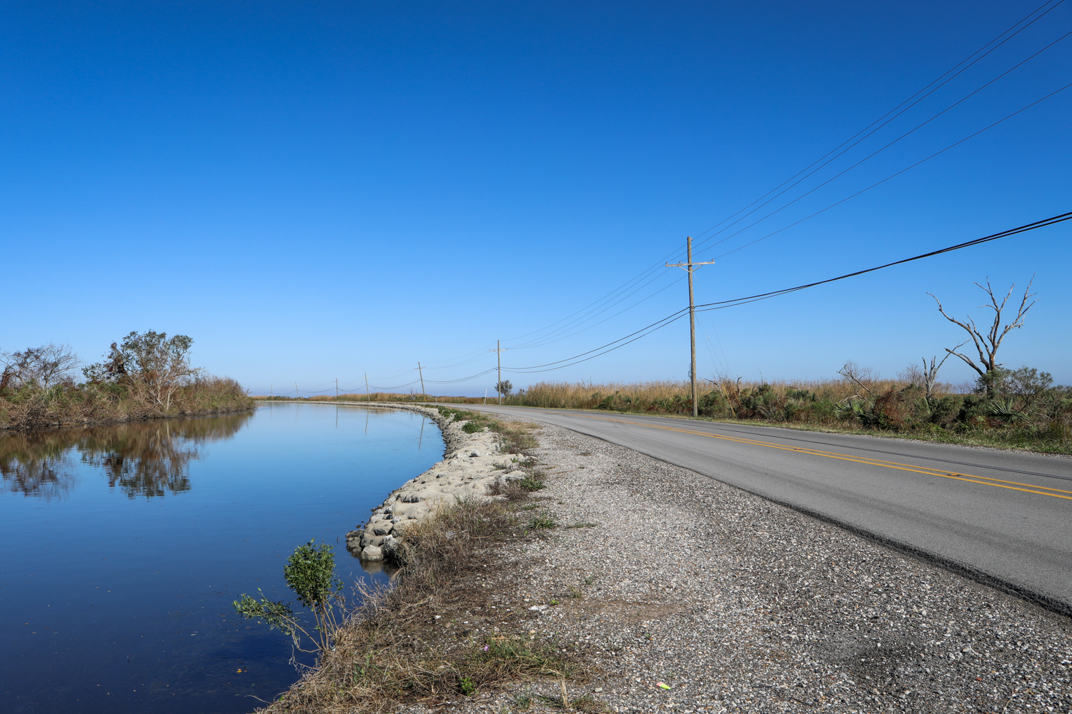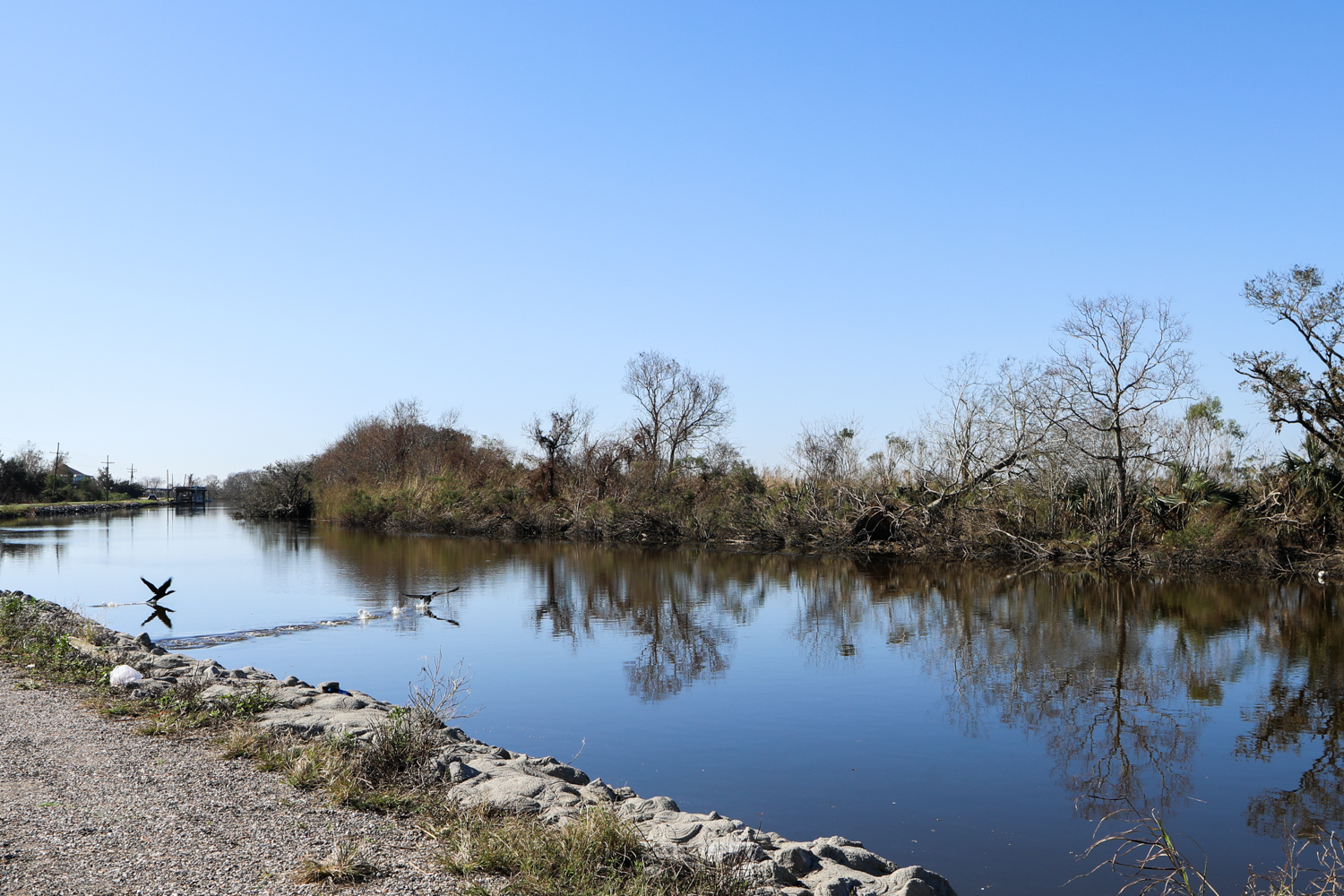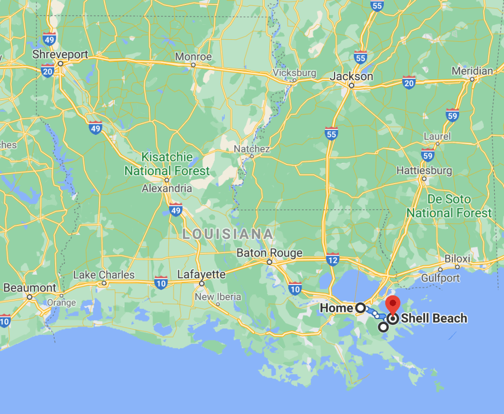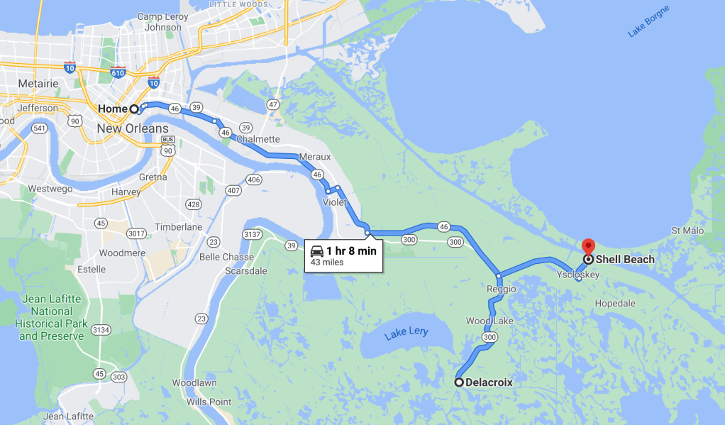 Route 46 follows the Mississippi from New Orleans, then cuts East as the Mississippi veers briefly back West toward English Turn. It’s joined by Route 300, which carries on South to its terminus: a town called Delacroix. (Well, it’s called Delacroix on maps, but the welcome sign identifies it as Delacroix Island, est. 1782. It’s not an island, but it was only reachable by boat until the 1930s so surely felt like one.) You have to really zoom in to see that Route 46 can indeed take you further East, to a town called Shell Beach that appears at first glance inaccessible in the sea of green that is the receding coast.