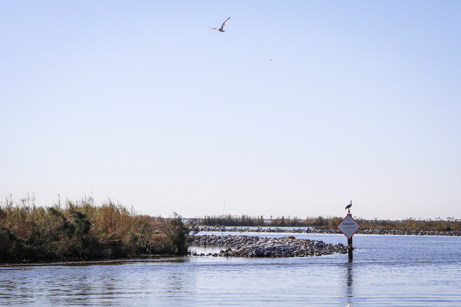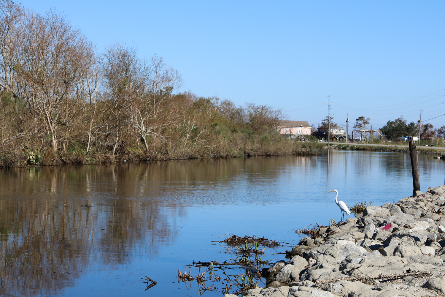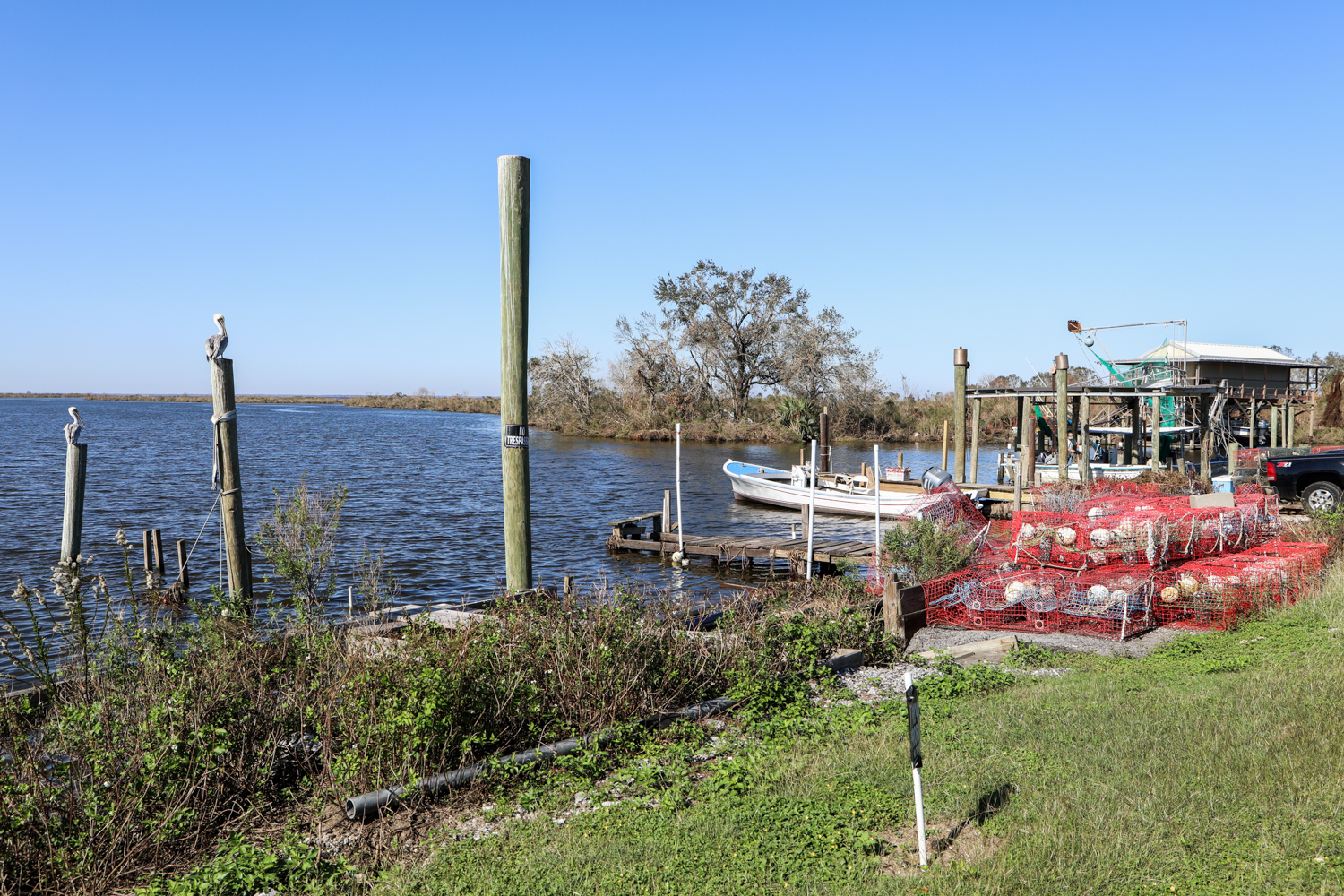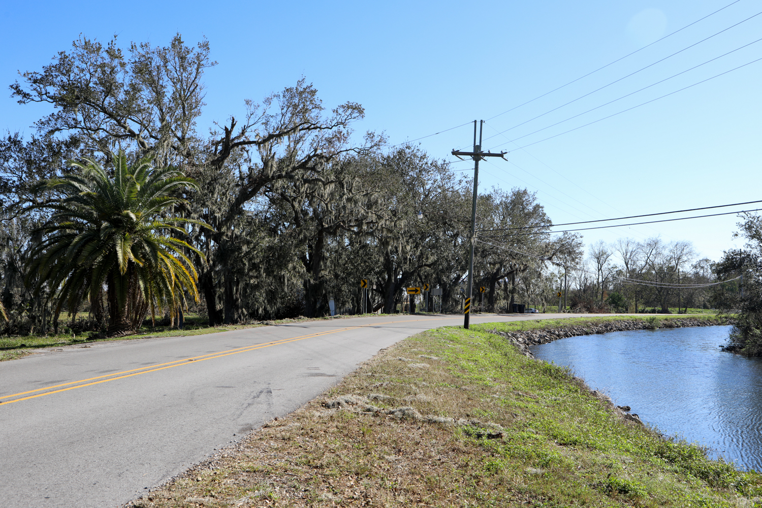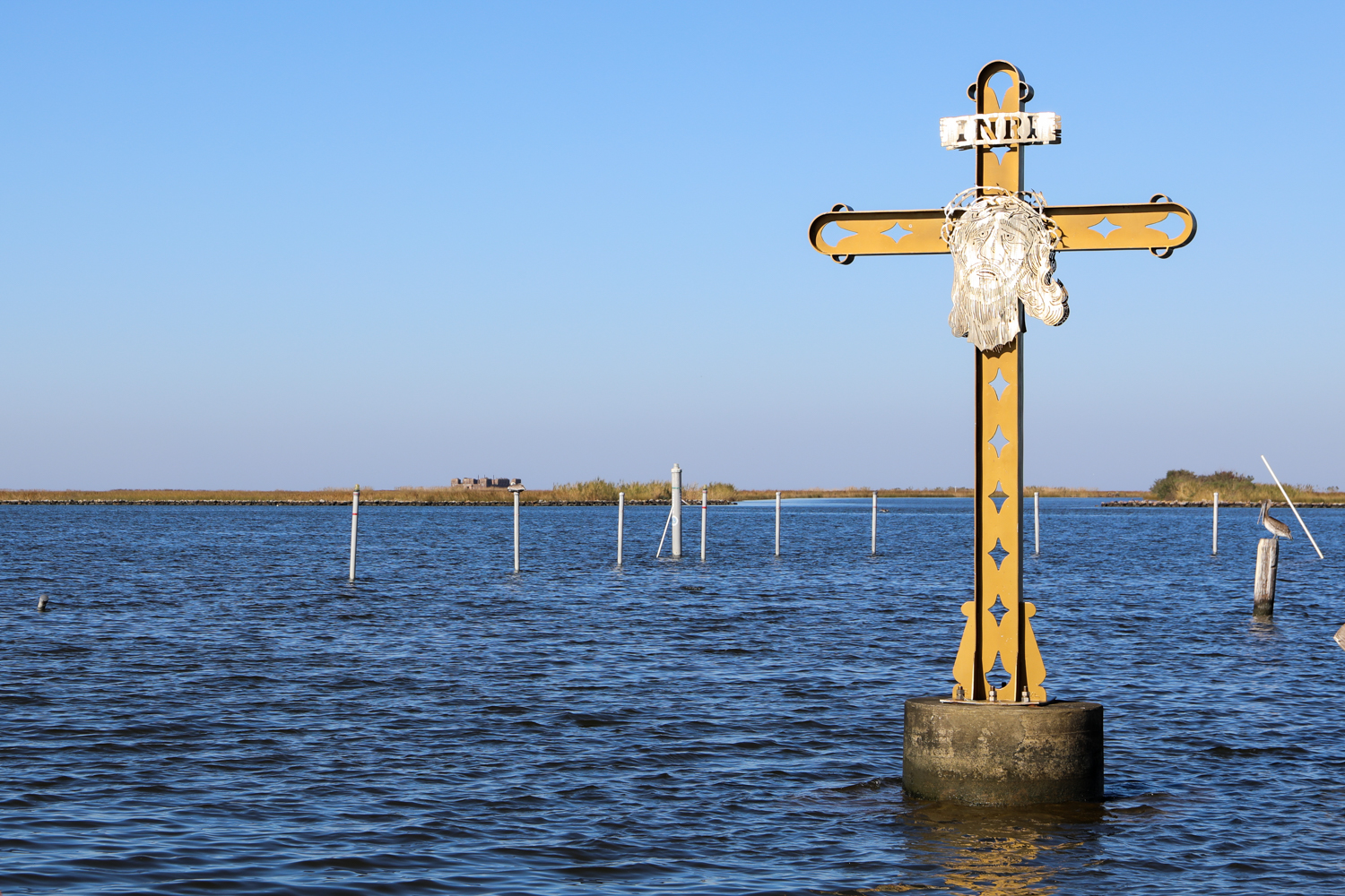 Route 46 follows the Mississippi from New Orleans, then cuts East as the Mississippi veers briefly back West toward English Turn. It’s joined by Route 300, which carries on South to its terminus: a town called Delacroix. (Well, it’s called Delacroix on maps, but the welcome sign identifies it as Delacroix Island, est. 1782. It’s not an island, but it was only reachable by boat until the 1930s so surely felt like one.) You have to really zoom in to see that Route 46 can indeed take you further East, to a town called Shell Beach that appears at first glance inaccessible in the sea of green that is the receding coast.