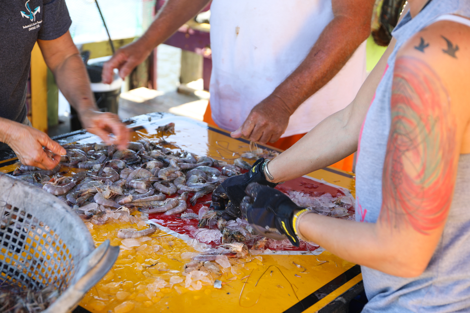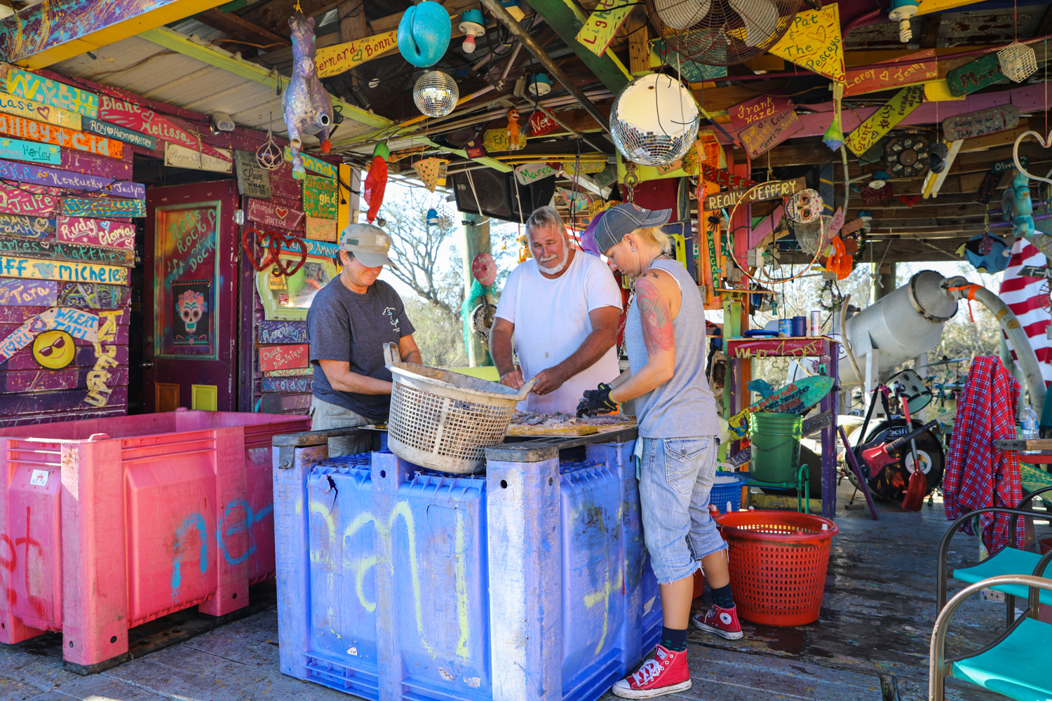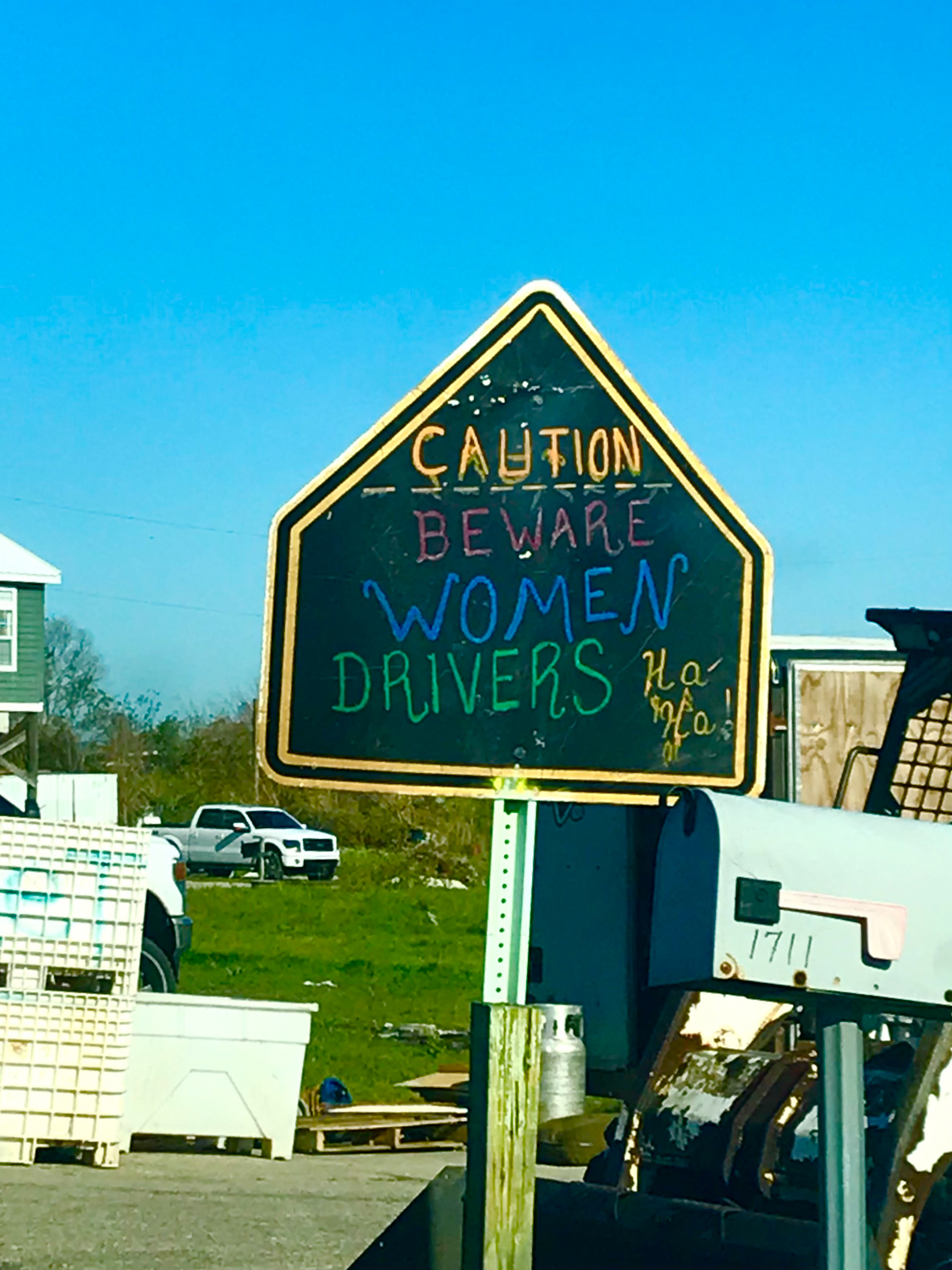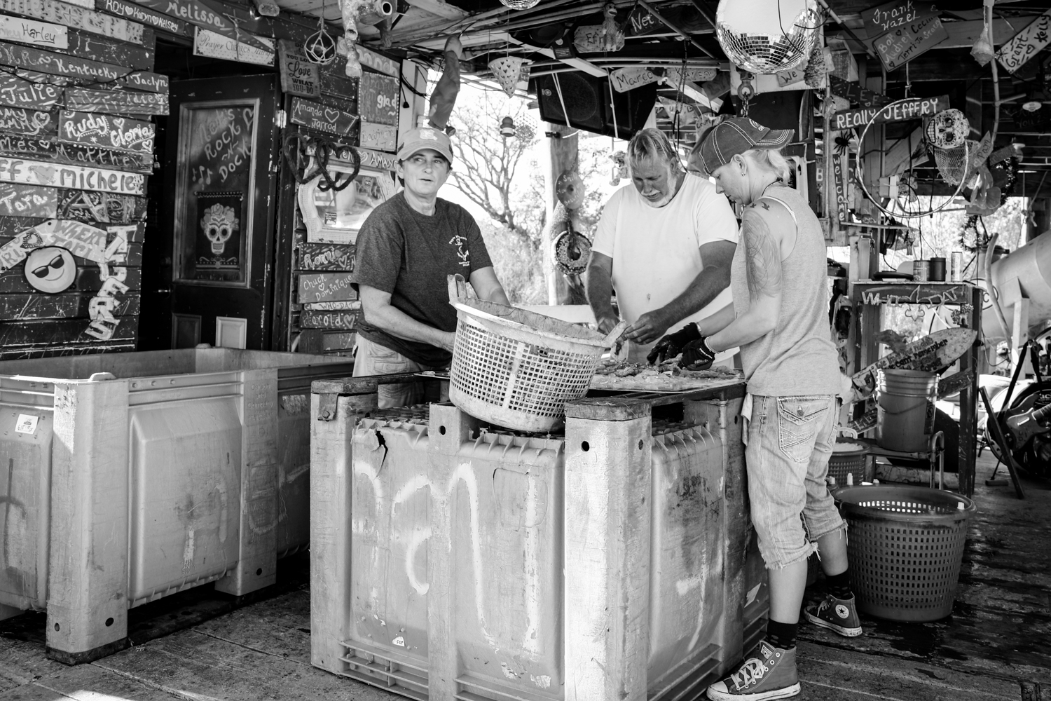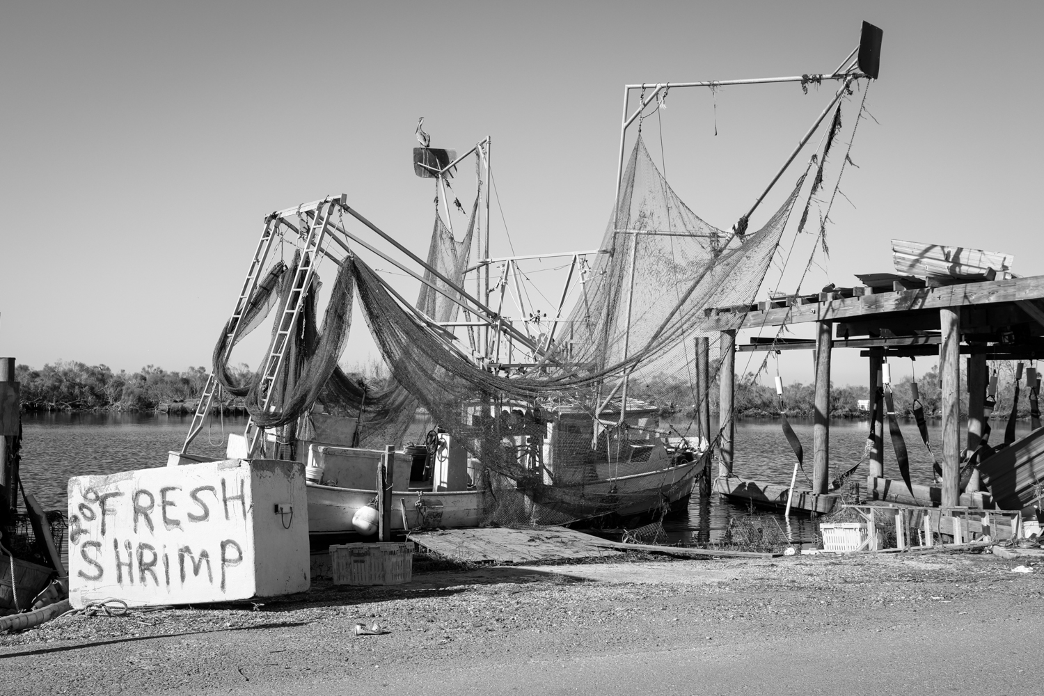 I first noticed the shrimp peelers at Net’s Rock-n-Dock as they laughed at me for taking a photo of the “Caution: Beware Women Drivers” sign across the road from their place. The colorful building seemed like some kind of café or souvenir shop so I decided to pop in with them on our way back out of town, which didn’t take long. (The region is full of misnomers– just as Delacroix Island is not really an island, neither is Shell Beach a beach; where the road came to an end we got some photos of the Katrina memorial and distant Fort Proctor and called it a day.)