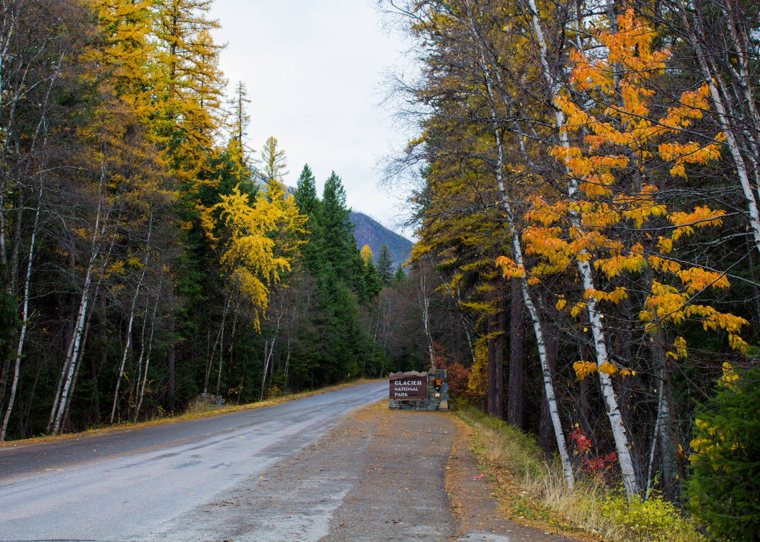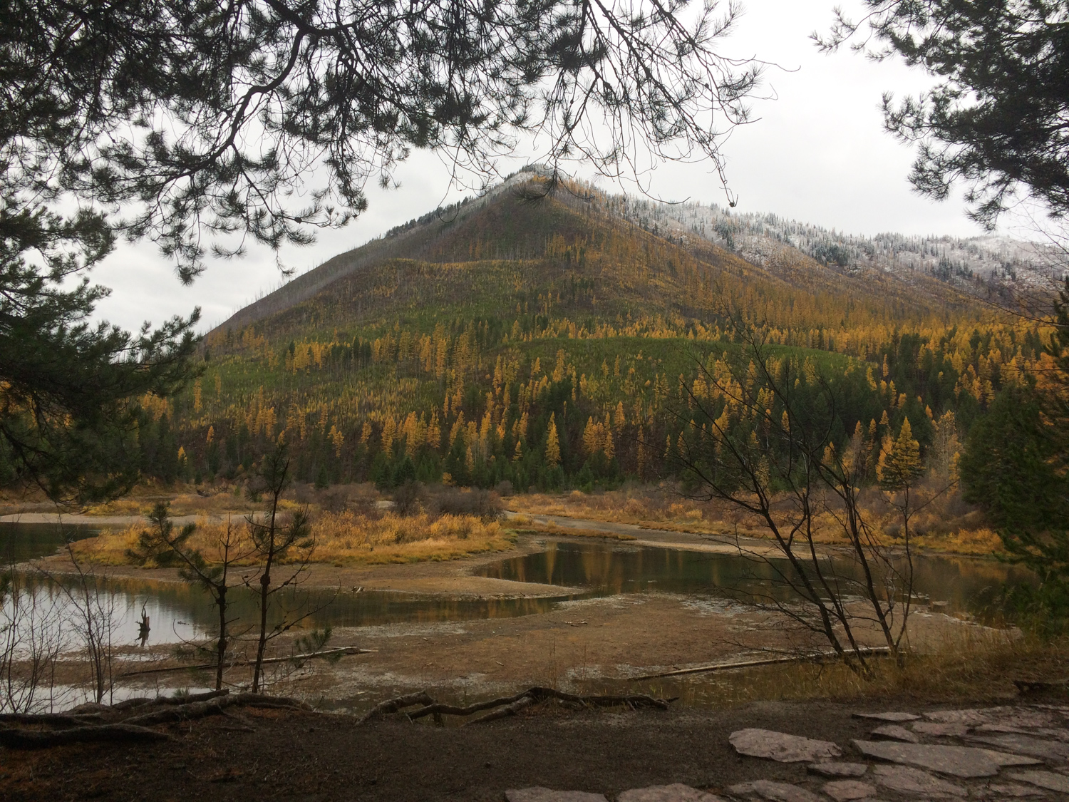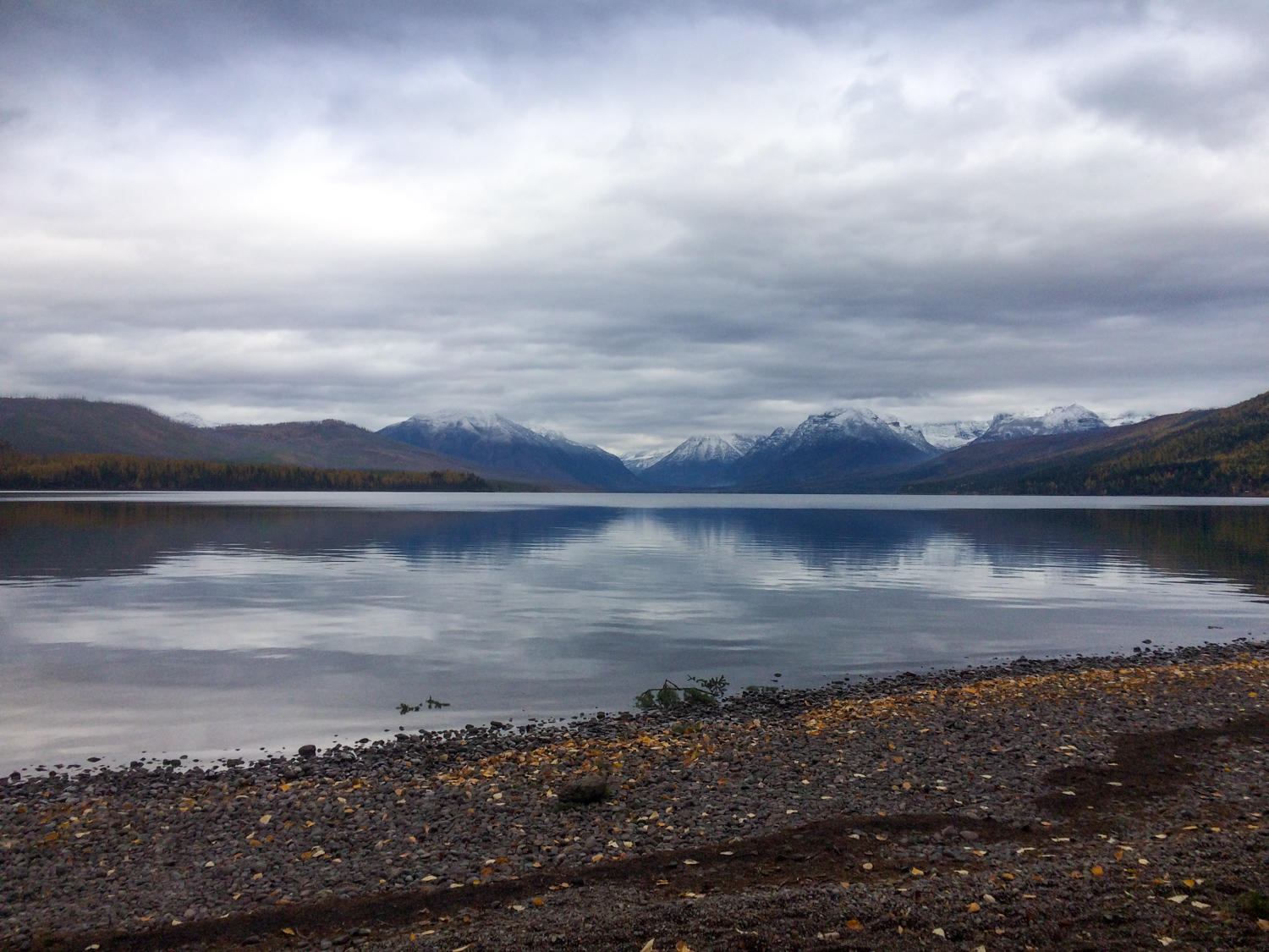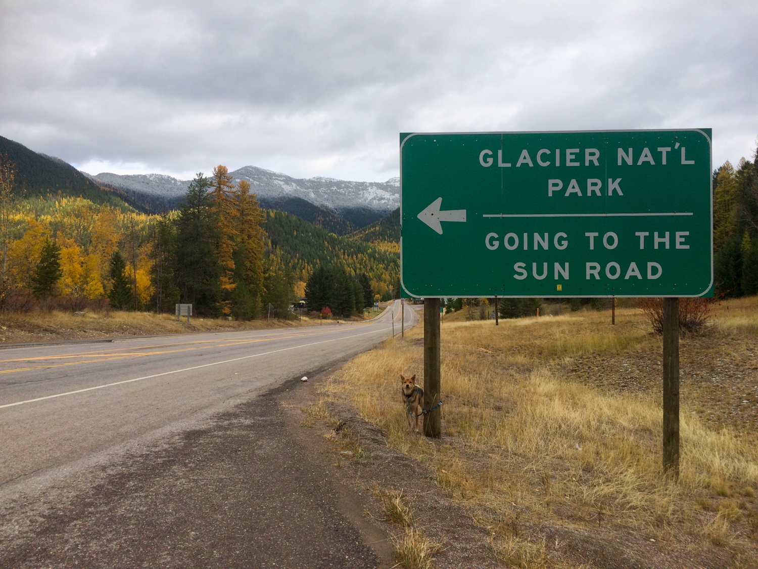 As I mentioned at the end of my Bison Range post, Glacier National Park was one of the stops on the trip for which I was most excited. I arrived after another few hours of driving, much of which was along Flathead Lake with its adjacent groves of cherry trees. The park was an awe-inspiring place for sure, especially with the abundance of yellow and otherwise fall-kissed trees, but I left feeling like I’d really only scratched the surface. The famous Going-to-the-Sun Road was only partially open, either because of the time of year or because of a wildfire that had been burning and was still smoldering in the area (who can remember?), and as with so many parks I was very limited to where I could go at all with a dog.