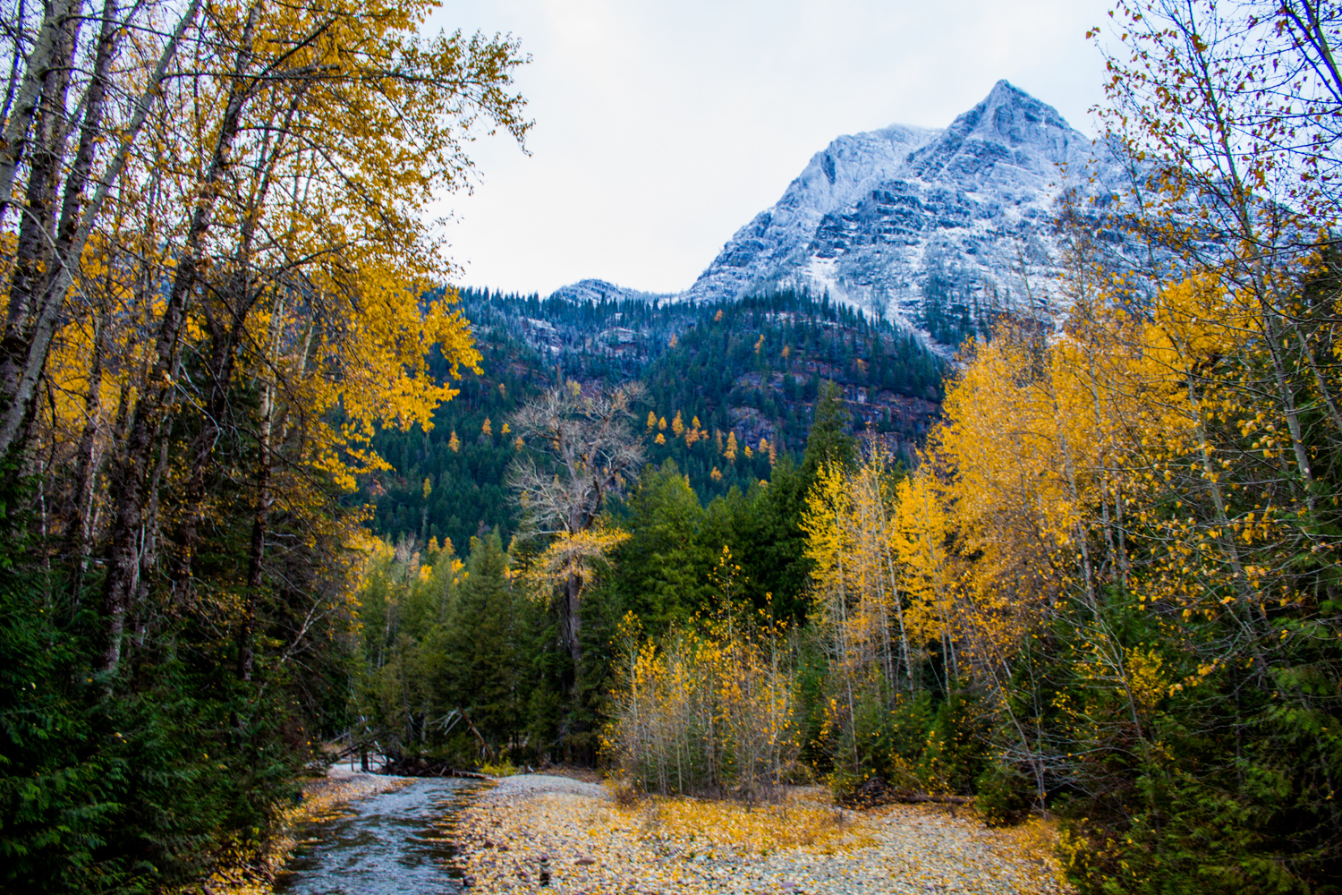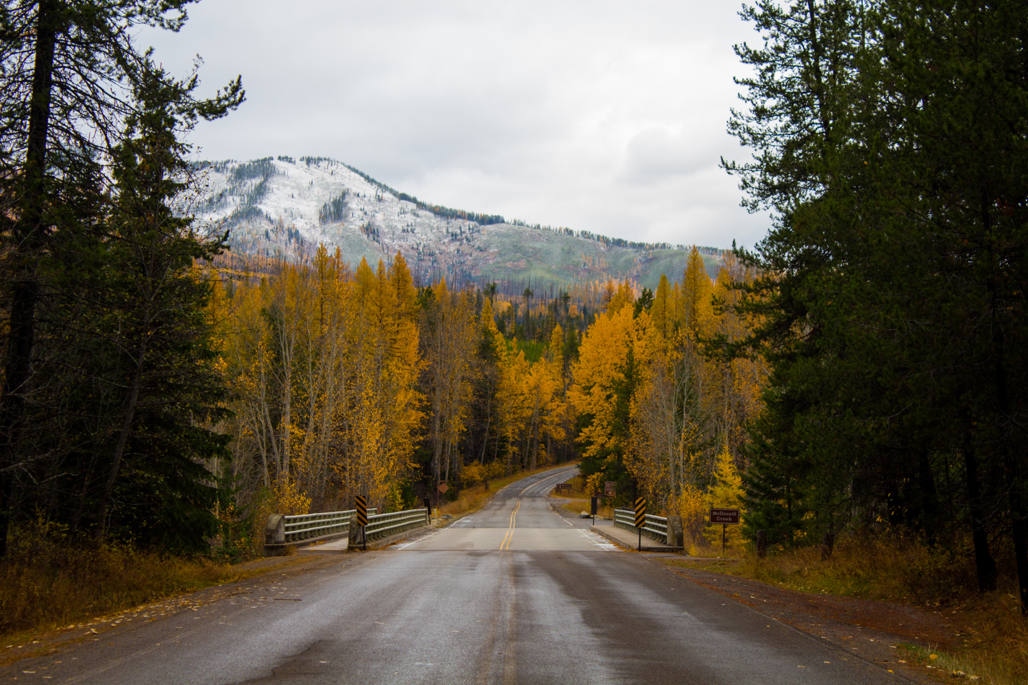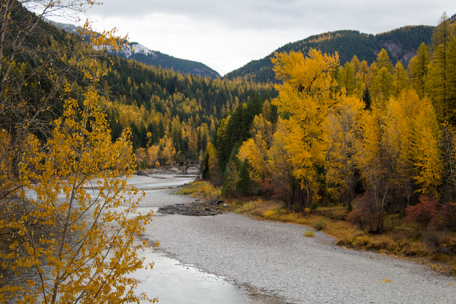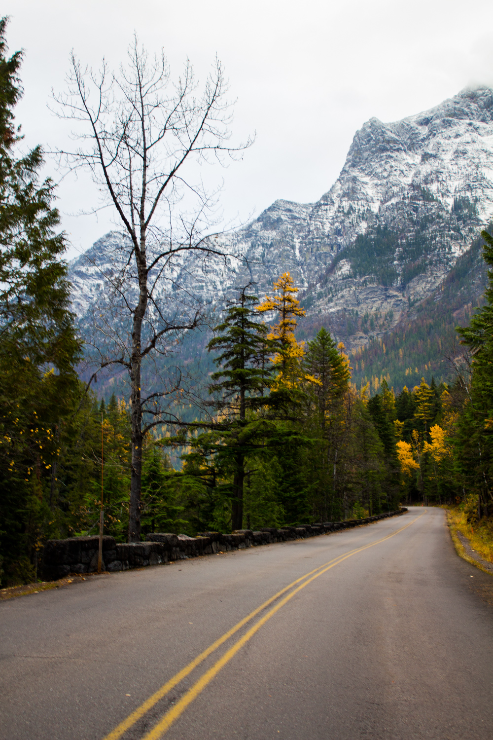 As I mentioned at the end of my Bison Range post, Glacier National Park was one of the stops on the trip for which I was most excited. I arrived after another few hours of driving, much of which was along Flathead Lake with its adjacent groves of cherry trees. The park was an awe-inspiring place for sure, especially with the abundance of yellow and otherwise fall-kissed trees, but I left feeling like I’d really only scratched the surface. The famous Going-to-the-Sun Road was only partially open, either because of the time of year or because of a wildfire that had been burning and was still smoldering in the area (who can remember?), and as with so many parks I was very limited to where I could go at all with a dog.