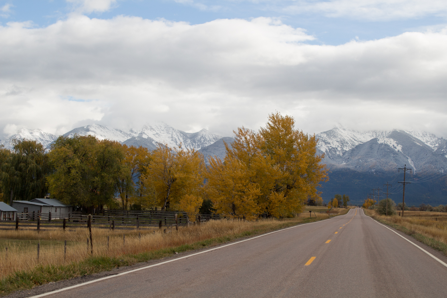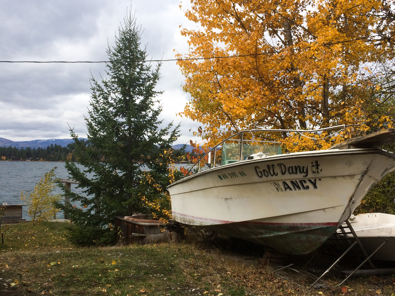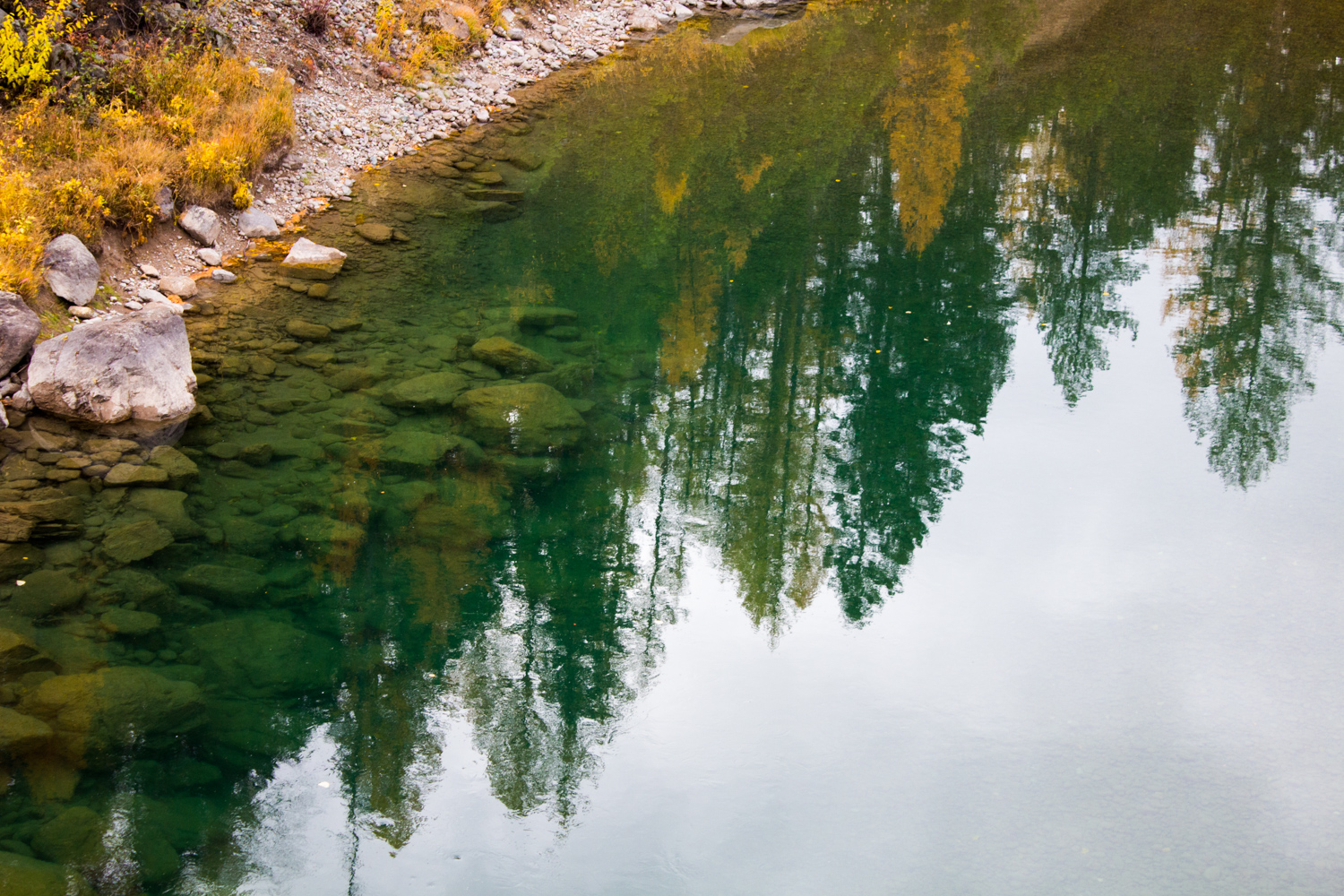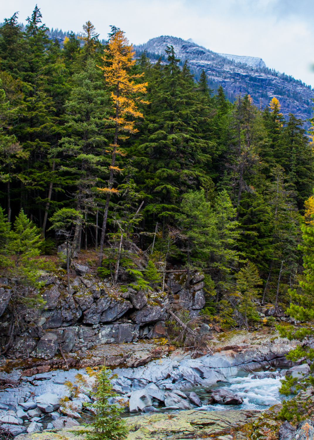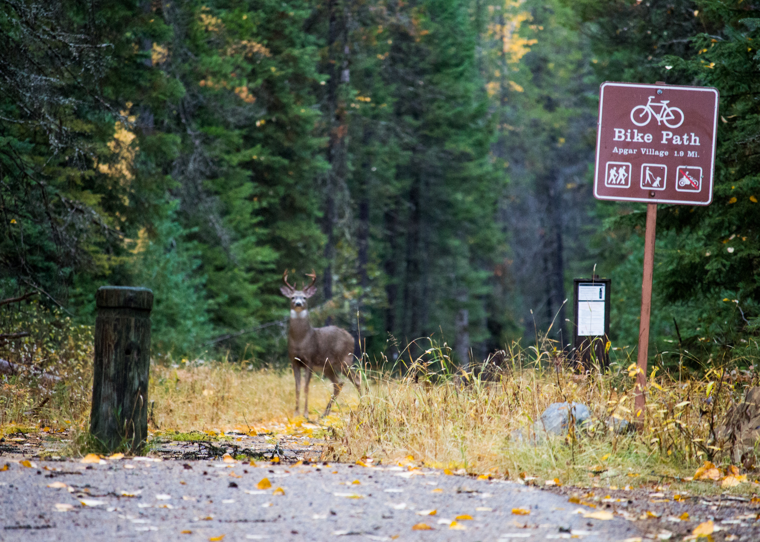 As I mentioned at the end of my Bison Range post, Glacier National Park was one of the stops on the trip for which I was most excited. I arrived after another few hours of driving, much of which was along Flathead Lake with its adjacent groves of cherry trees. The park was an awe-inspiring place for sure, especially with the abundance of yellow and otherwise fall-kissed trees, but I left feeling like I’d really only scratched the surface. The famous Going-to-the-Sun Road was only partially open, either because of the time of year or because of a wildfire that had been burning and was still smoldering in the area (who can remember?), and as with so many parks I was very limited to where I could go at all with a dog.