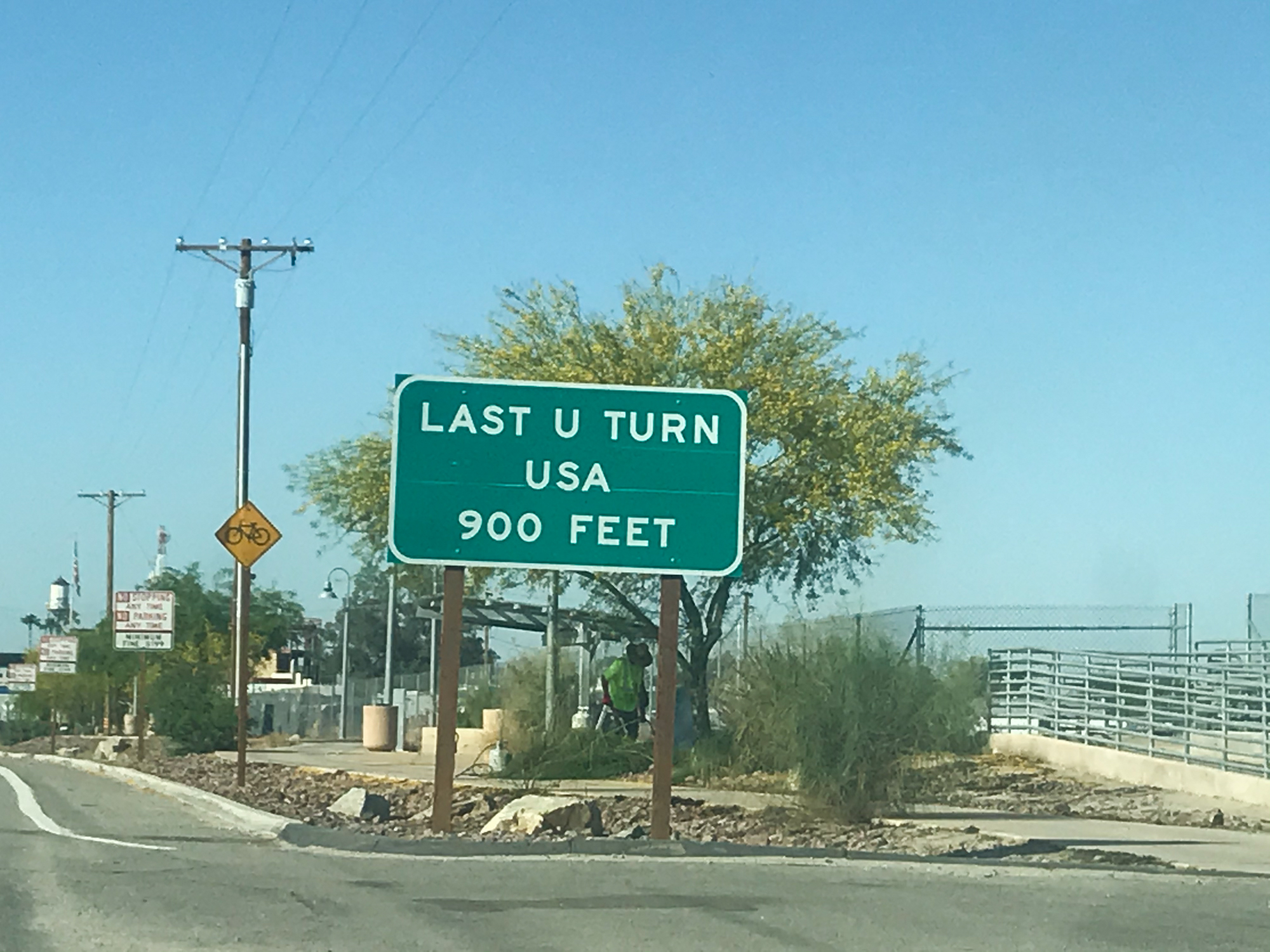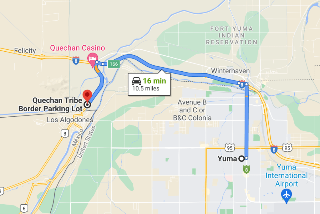 The cowboy had given me basic instructions for crossing the border from Yuma which proved substantial: pay $6 to park at the Quechan Tribe parking lot on the nearby Indian reservation, and simply walk across. He failed to mention the reservation was just barely across the California border, so I found myself unexpectedly adding California to the list of states I saw on my trip. I intended to verify with an authority at the border that I would, in fact, be able to get back with only my license… but there was literally no one manning the crossing.