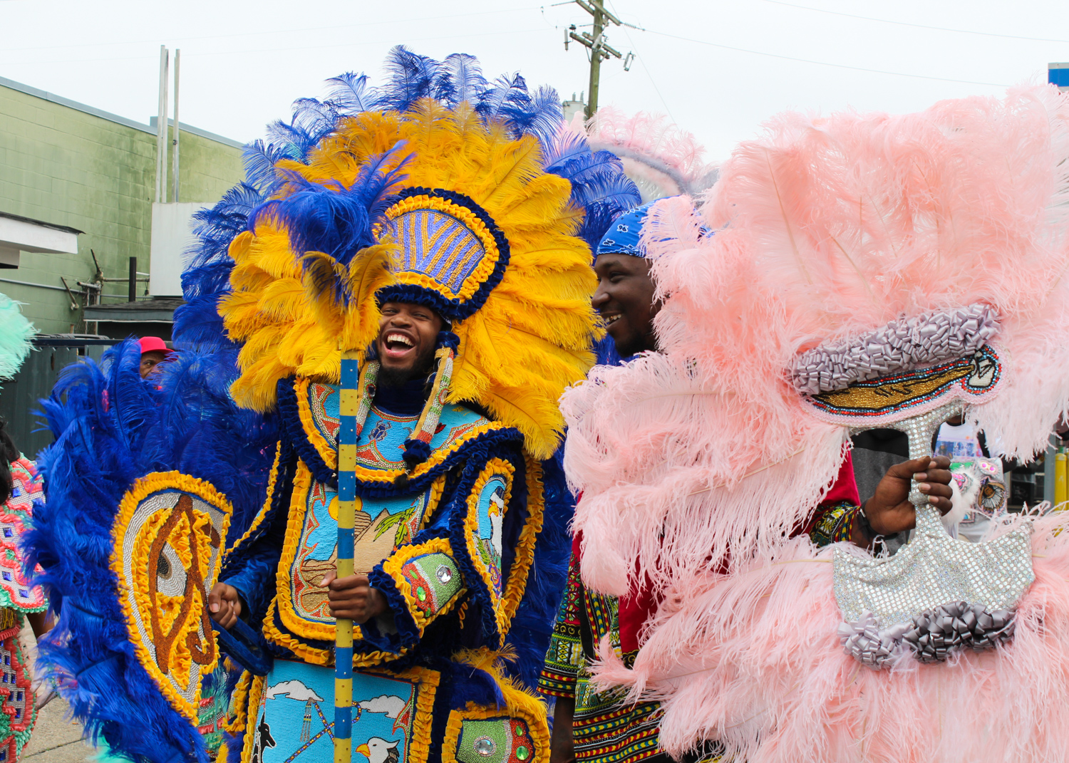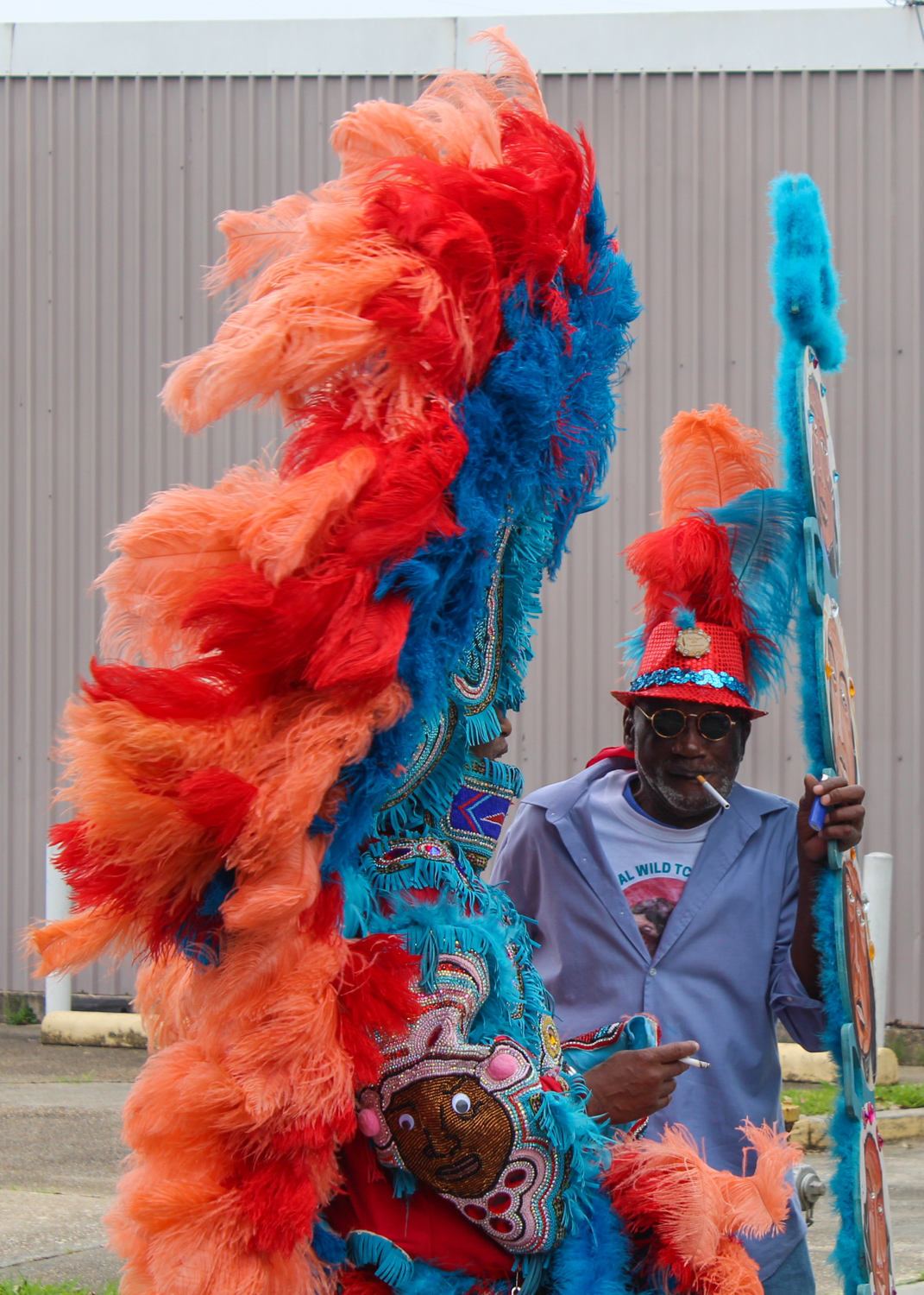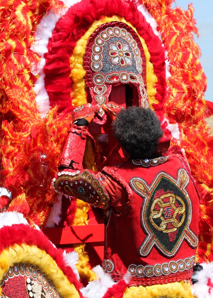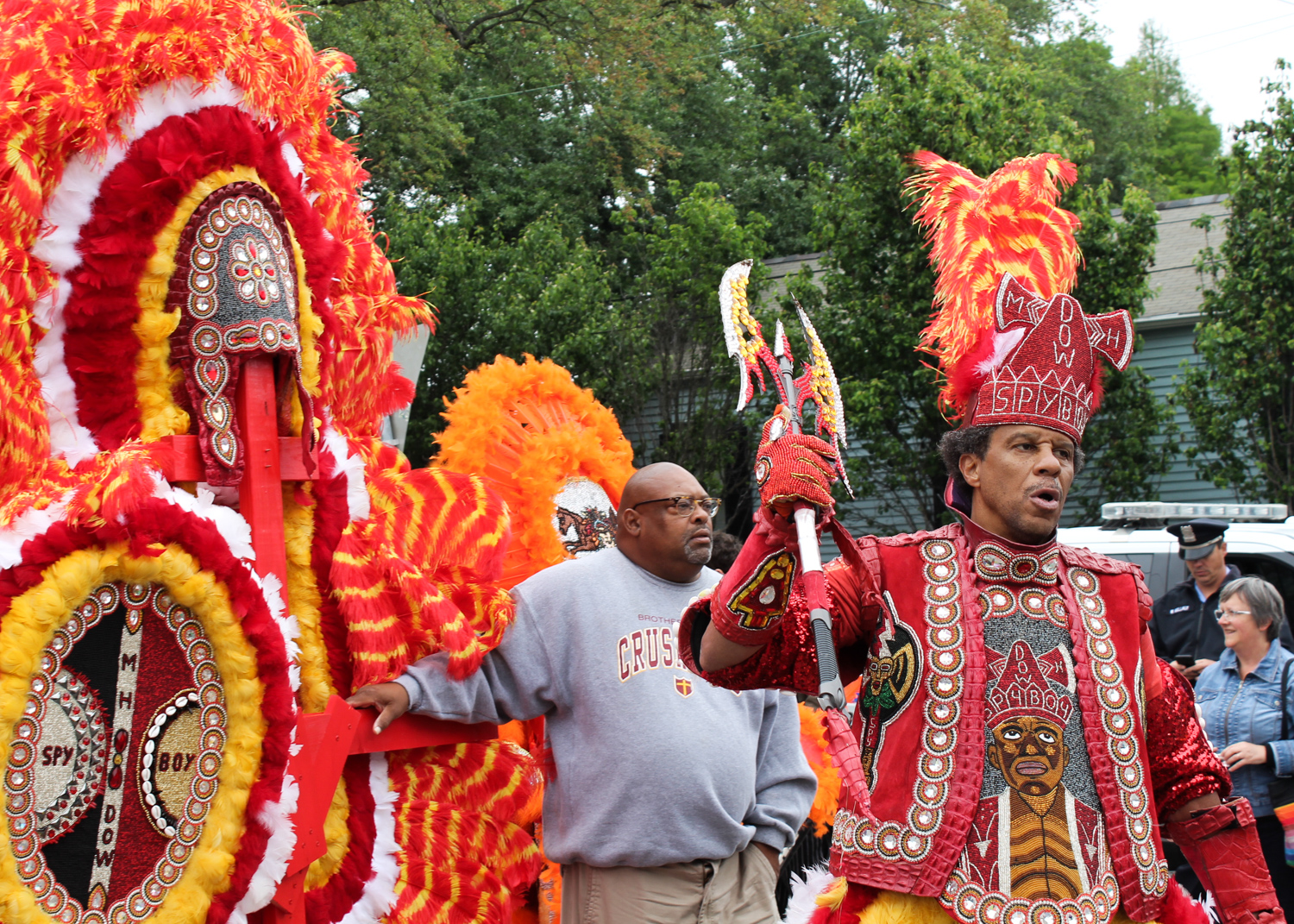 In these parades tribes act out what years ago sometimes transpired as true altercations and acts of aggression: Spy Boys and Flag Boys alert the Big Chief to the presence of a rival tribe through special calls and gestures, and the Big Chiefs size each other up accordingly. Nowadays the standoffs are of a more friendly nature, culminating with an affirmation of how ‘pretty’ the Chiefs are in their intricate, heavy suits.