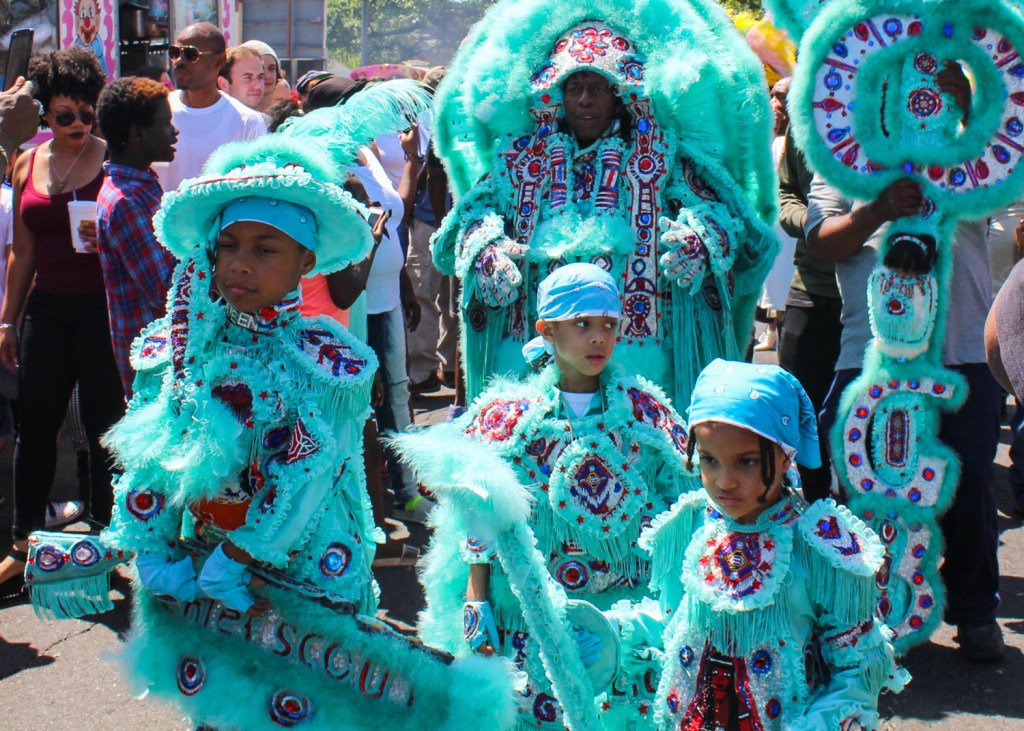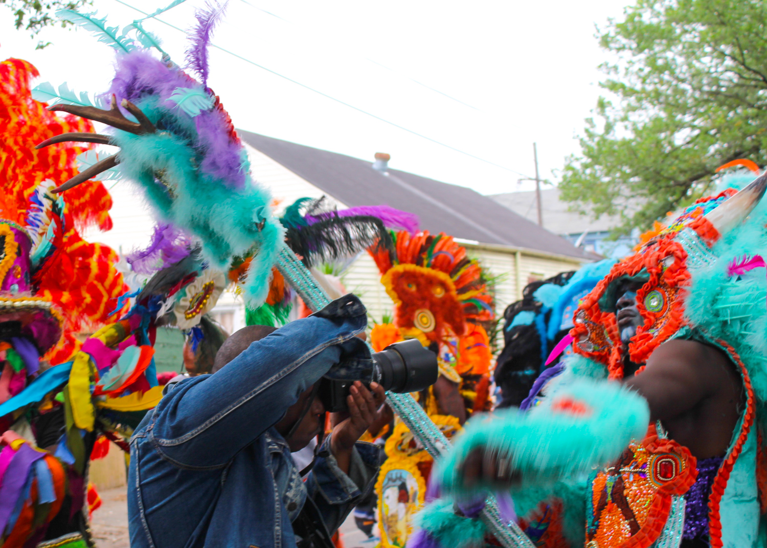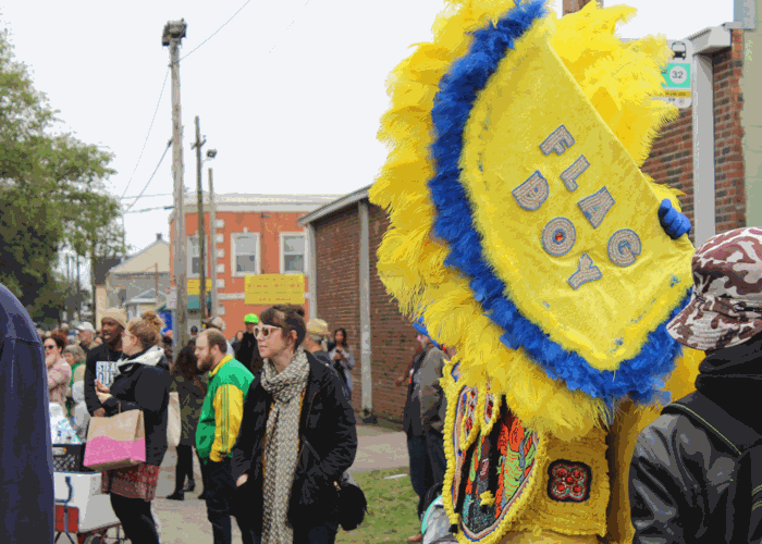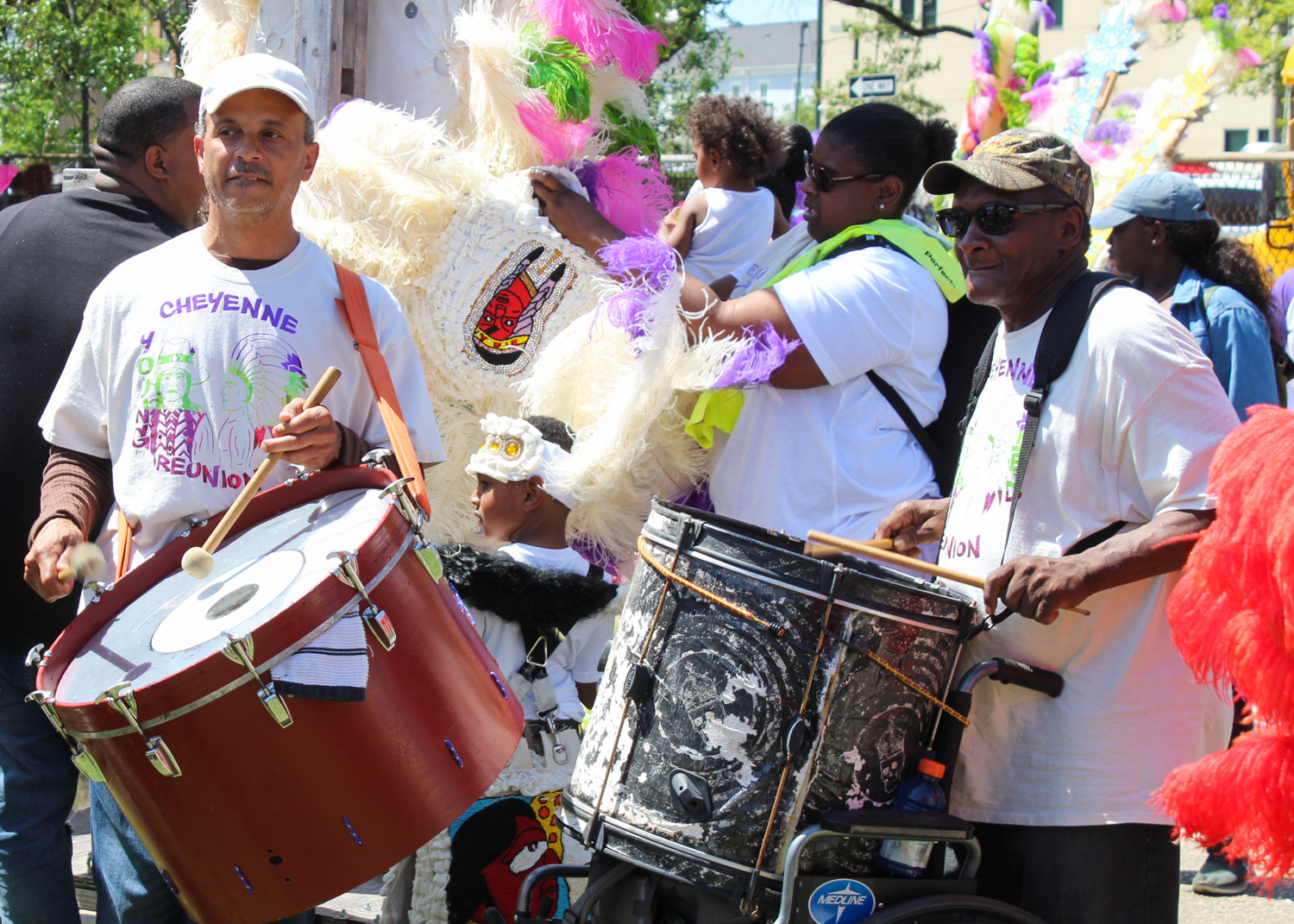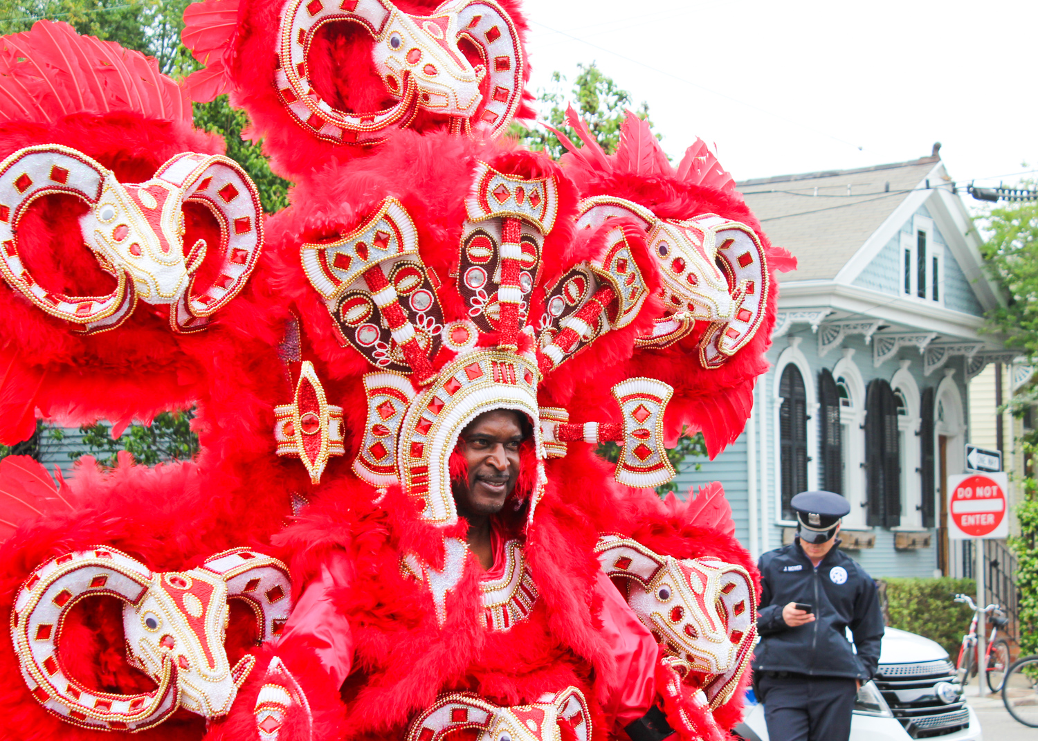 In these parades tribes act out what years ago sometimes transpired as true altercations and acts of aggression: Spy Boys and Flag Boys alert the Big Chief to the presence of a rival tribe through special calls and gestures, and the Big Chiefs size each other up accordingly. Nowadays the standoffs are of a more friendly nature, culminating with an affirmation of how ‘pretty’ the Chiefs are in their intricate, heavy suits.