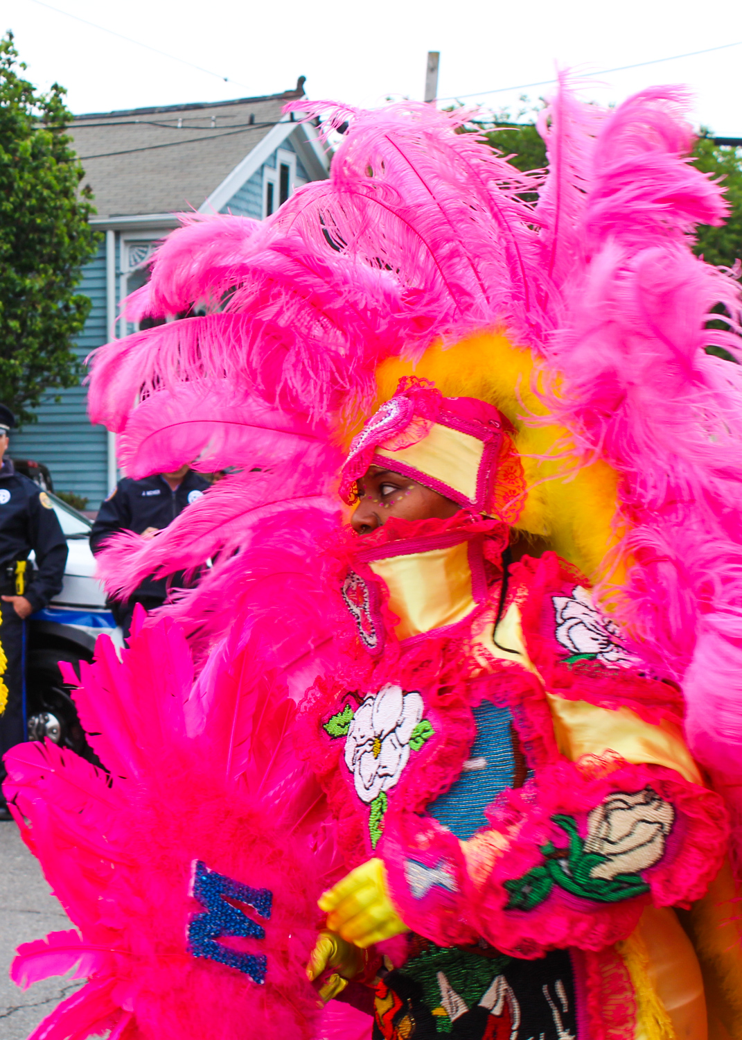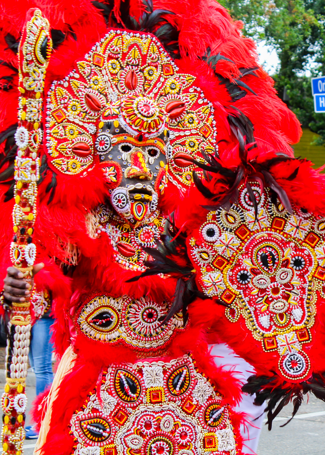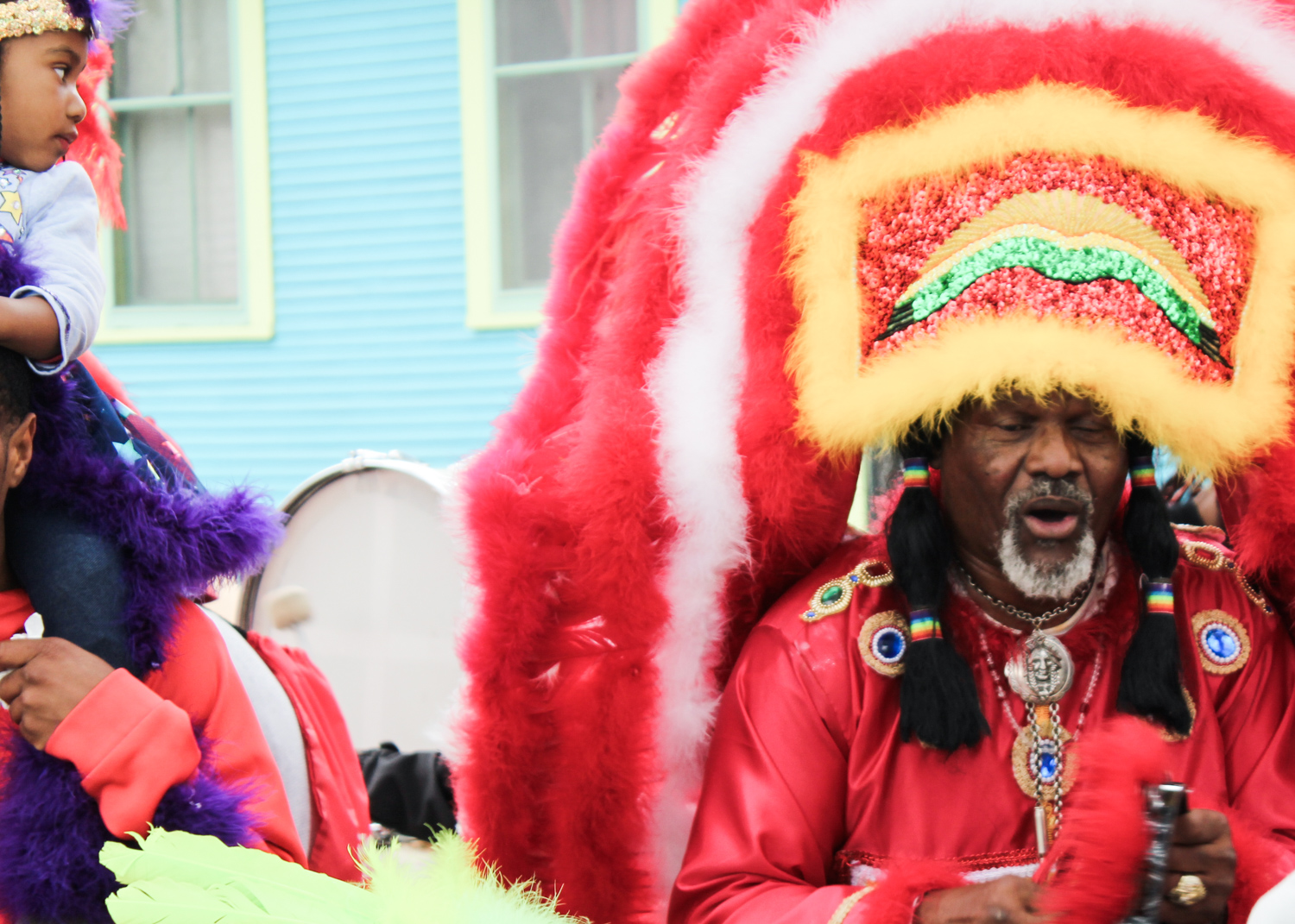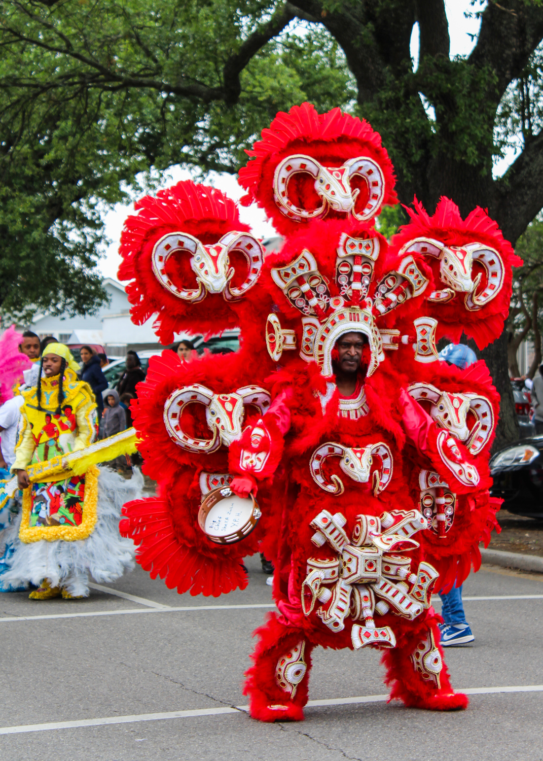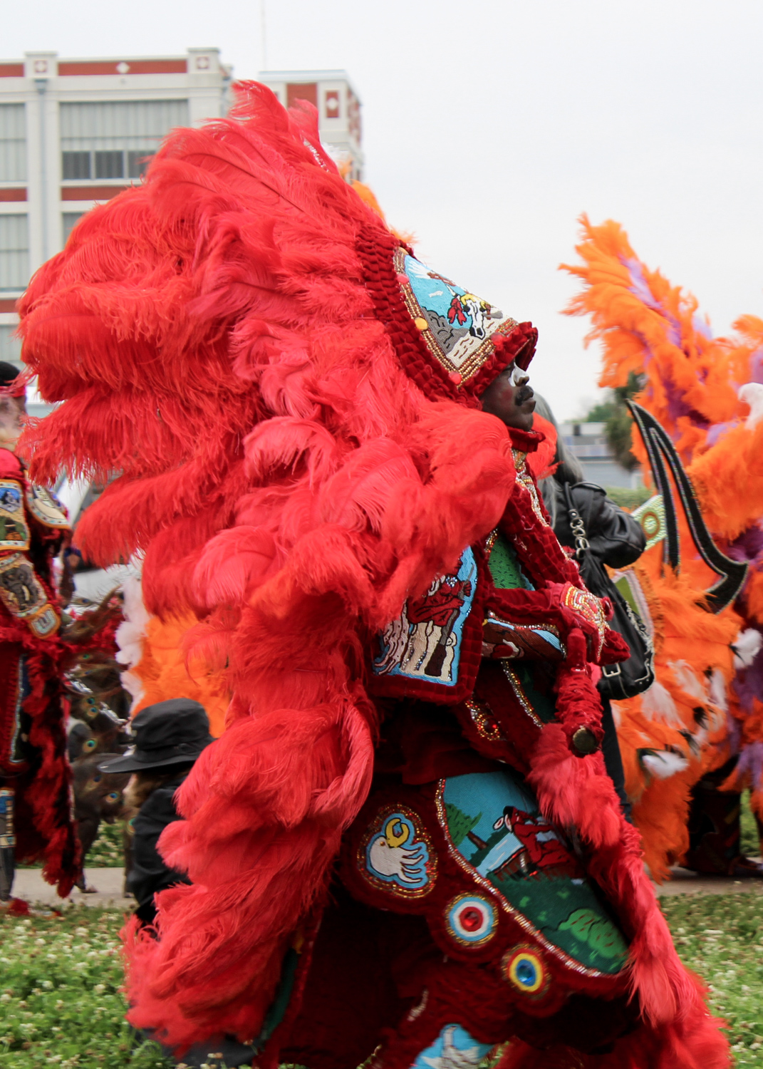 I admittedly had only the prominent storyline of Big Chief Lambreaux from the David Simon show Treme (required watching for any New Orleans transplant!) as background on the Indians before attending these events. This had given me at least some appreciation for the time, skill, and dedication that go into the fashioning of the suits (not to mention how seriously the tradition is taken by those who participate), but seeing so many in person, whooping and chanting and marching to the beat of any number of drums, was really a treat. Read more on the Indians here or here.