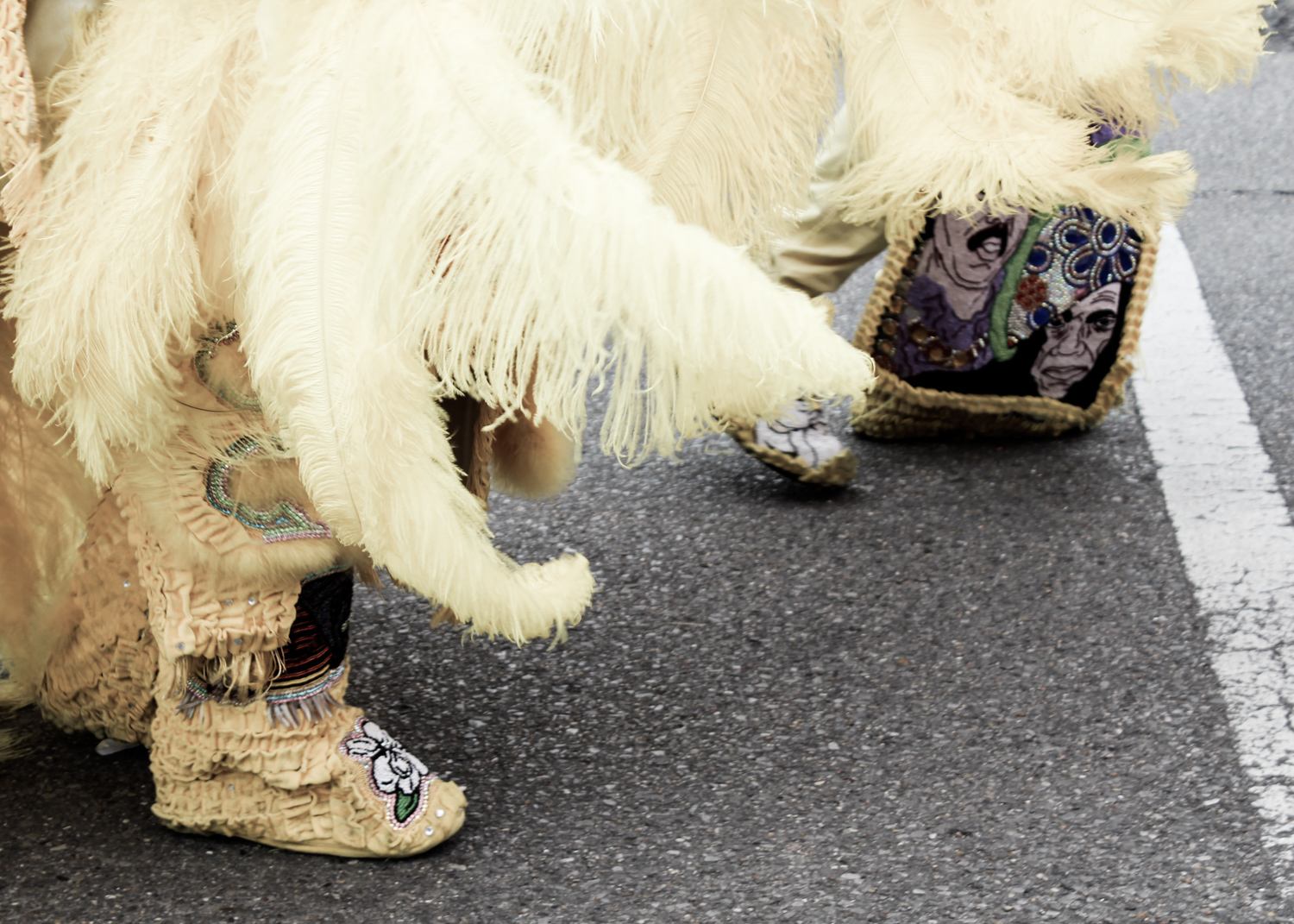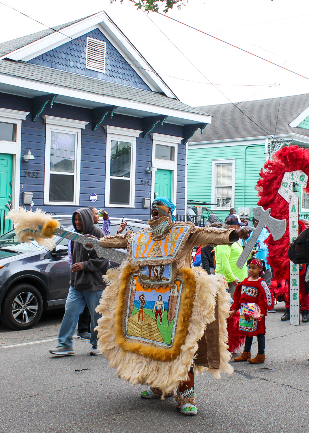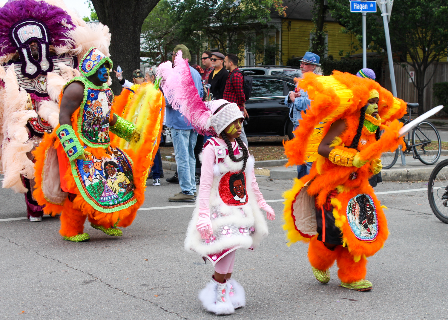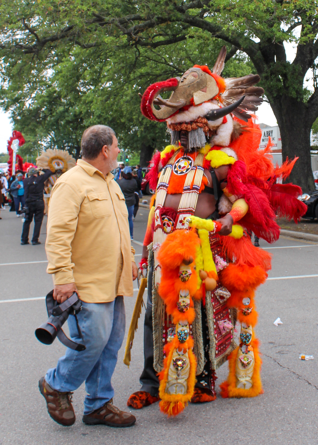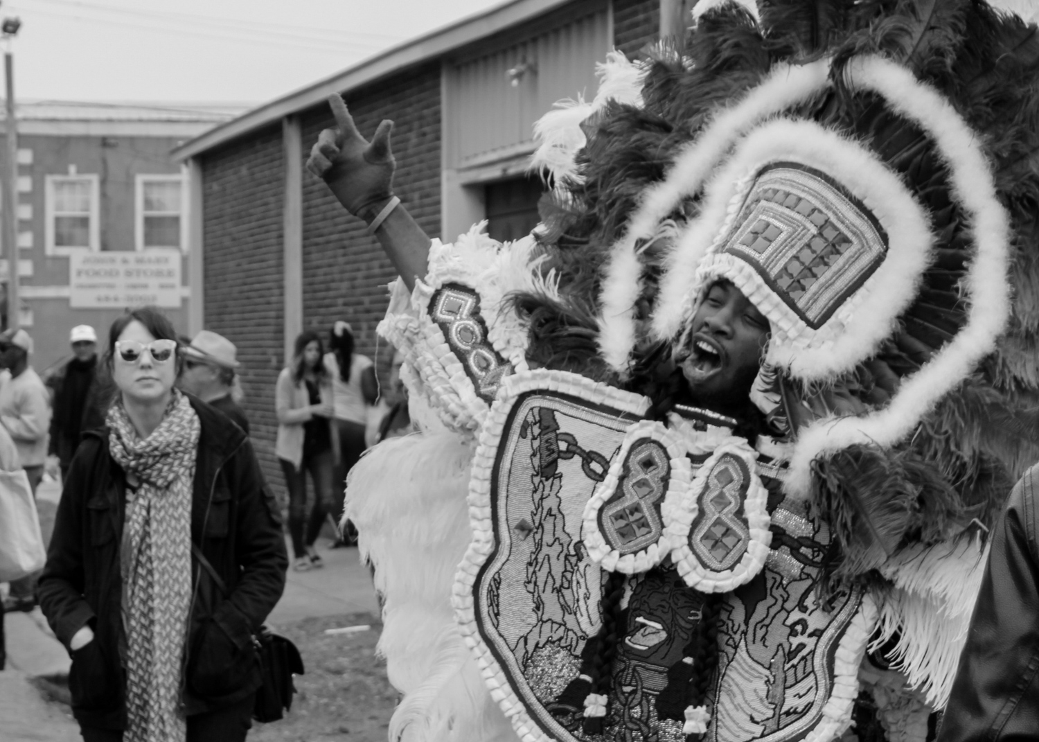 I admittedly had only the prominent storyline of Big Chief Lambreaux from the David Simon show Treme (required watching for any New Orleans transplant!) as background on the Indians before attending these events. This had given me at least some appreciation for the time, skill, and dedication that go into the fashioning of the suits (not to mention how seriously the tradition is taken by those who participate), but seeing so many in person, whooping and chanting and marching to the beat of any number of drums, was really a treat. Read more on the Indians here or here.