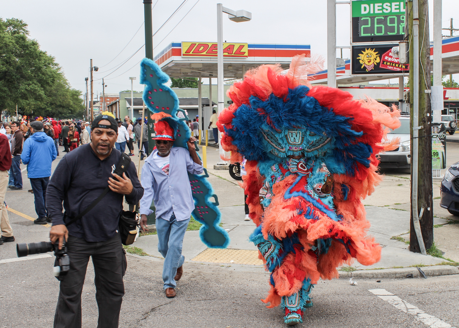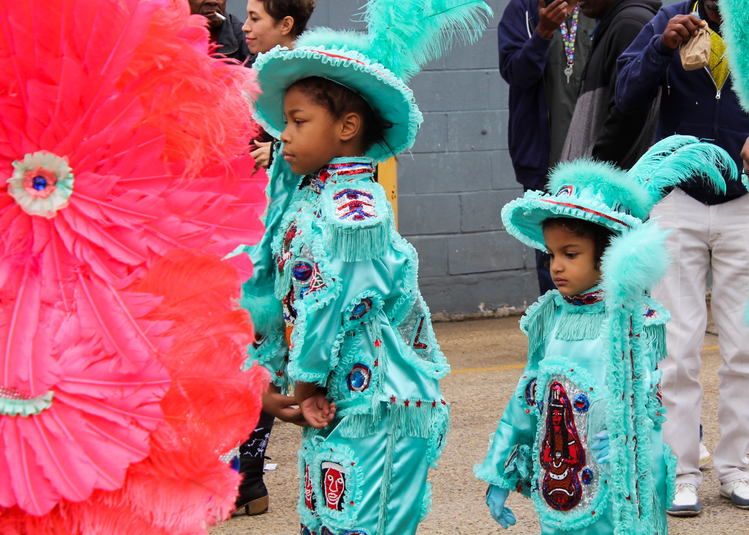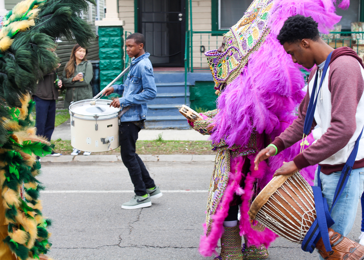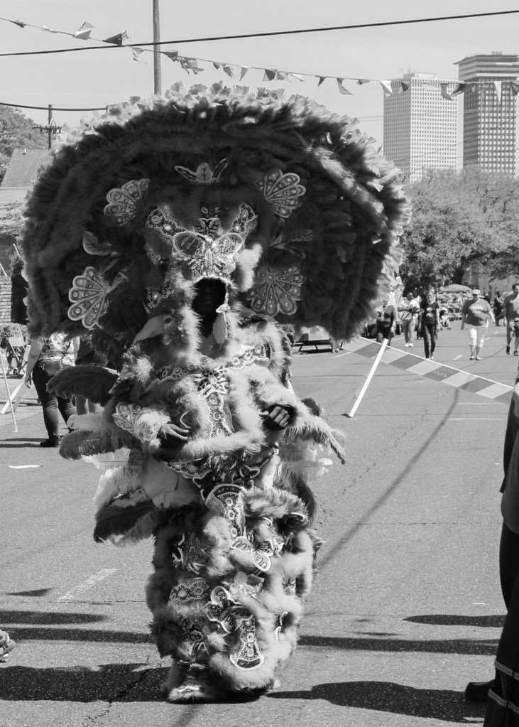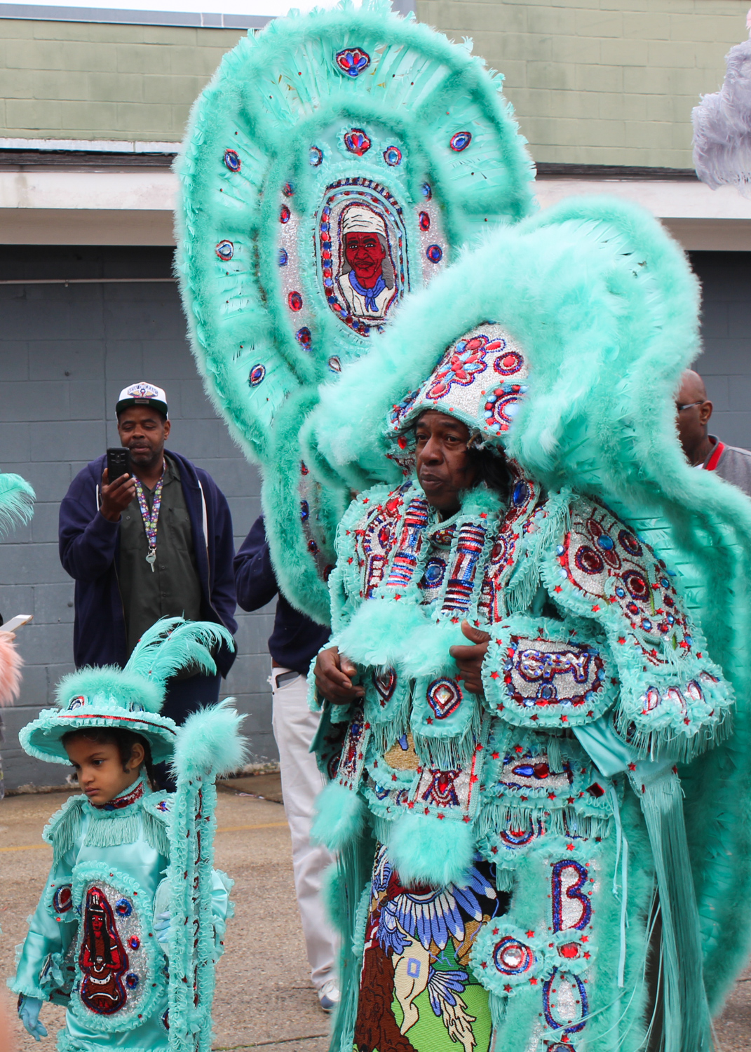 I admittedly had only the prominent storyline of Big Chief Lambreaux from the David Simon show Treme (required watching for any New Orleans transplant!) as background on the Indians before attending these events. This had given me at least some appreciation for the time, skill, and dedication that go into the fashioning of the suits (not to mention how seriously the tradition is taken by those who participate), but seeing so many in person, whooping and chanting and marching to the beat of any number of drums, was really a treat. Read more on the Indians here or here.