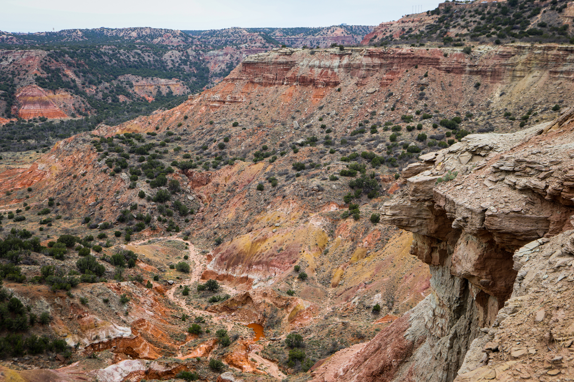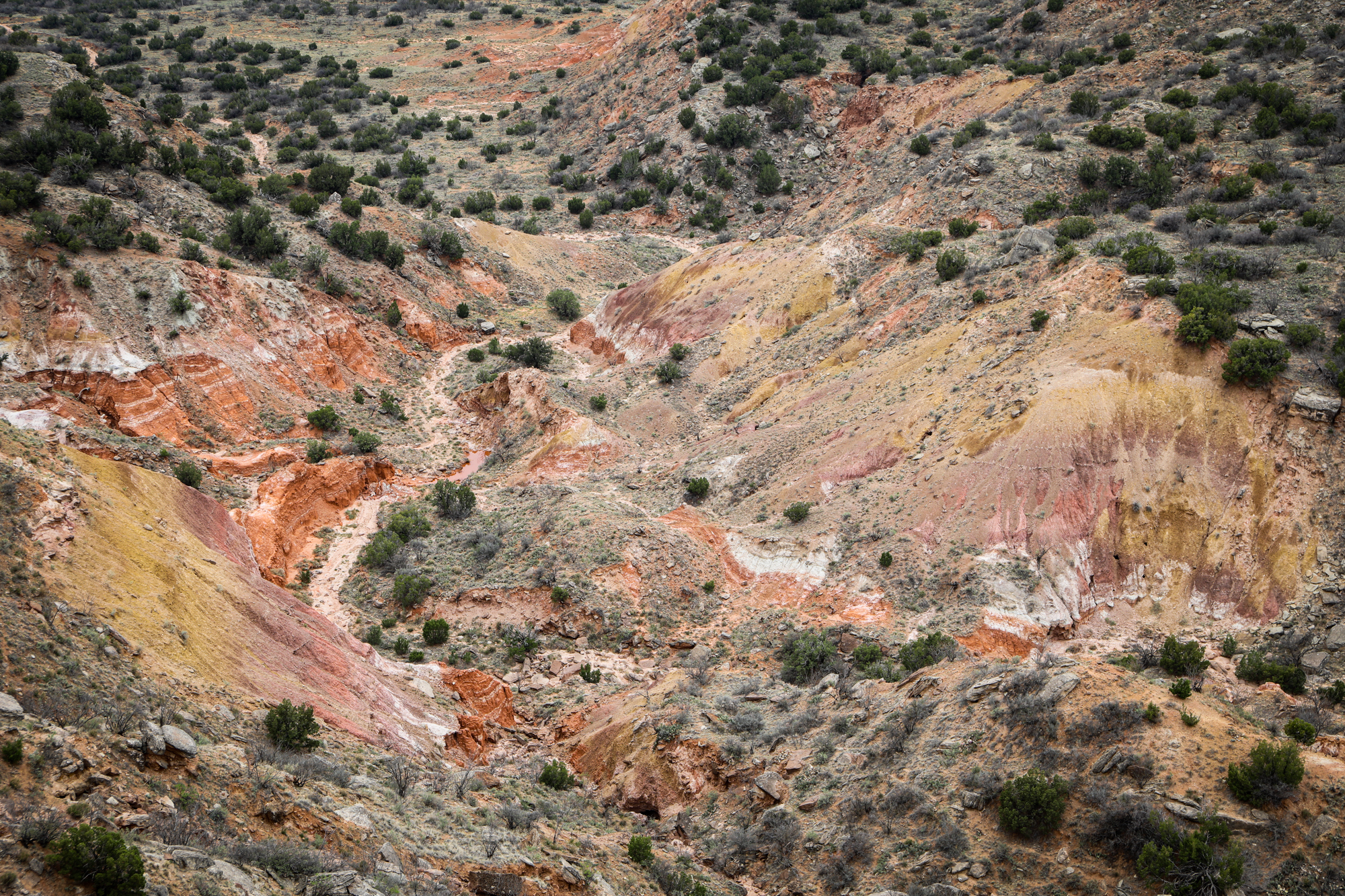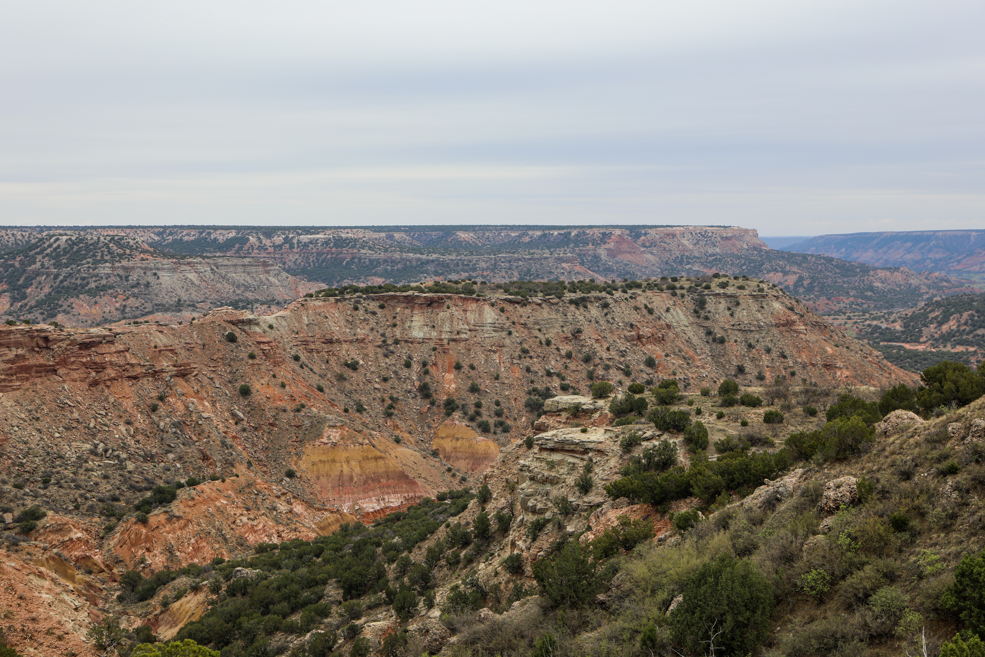 Palo Duro Canyon was formed by the Prairie Dog Fork of the Red River (my new preferred faux-expletive) carving its way through these High Plains over the centuries, revealing stripes of different colored stone from different geological eras.