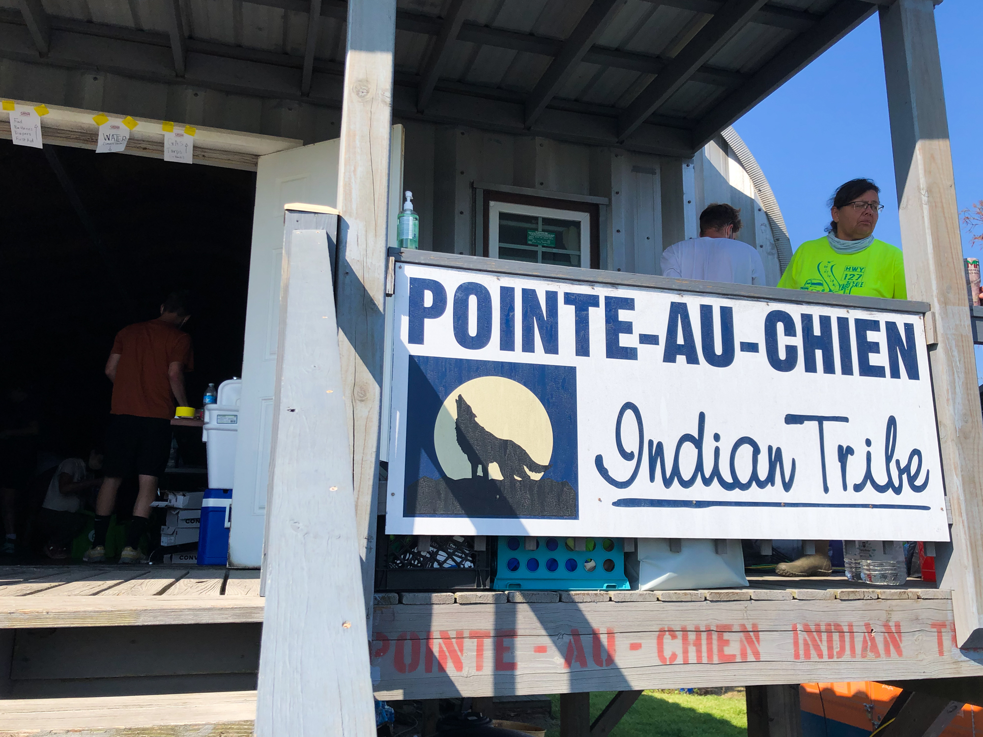 I wound up in a group that helped clear the yard of a man named Alton Billiot, who was in his 60s and had lived on the little strip of land his whole life. He said Katrina hadn’t compared; they’d flooded then, which had happened before, and decided to raise the house up. But he’d never experienced winds like Ida brought. His brother Roland lived next door, at a considerably worse-damaged house. Roland was sitting up in an armchair in what had been the living room, before losing all its walls, when we arrived. An American flag with a Native American superimposed over it was flying over the building– the Billiots identified as members of the local Pointe Au Chien Indian tribe, and a daughter-in-law was from the Houma tribe. (Yes, the Indian tribe does seem to spell their name differently than the town.)