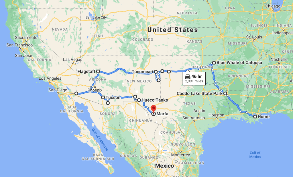 If this story sounds familiar, it is (almost went to Painted Desert, almost went to Meteor Crater, almost went to Saguaro National Park)… but it also doesn’t end there! My next stop, as suggested in my Road Trip USA guidebook, was Hueco Tanks, a prehistoric site just across the Texas border and not far off my route to Marfa. The line of cars leading up to the entrance didn’t bode well, and soon enough a ranger came by to explain the situation: because of COVID, they were only allowing five cars in at a time, after which visitors would exit their cars to explore the site. Except good ol’ Ollie pup was growling and barking at the ranger the whole time, and he told me that while dogs are allowed, people are discouraged from bringing aggressive pets [smile/sweat emoji]. So for the fifth time on the trip, we were thwarted from seeing an intended attraction.