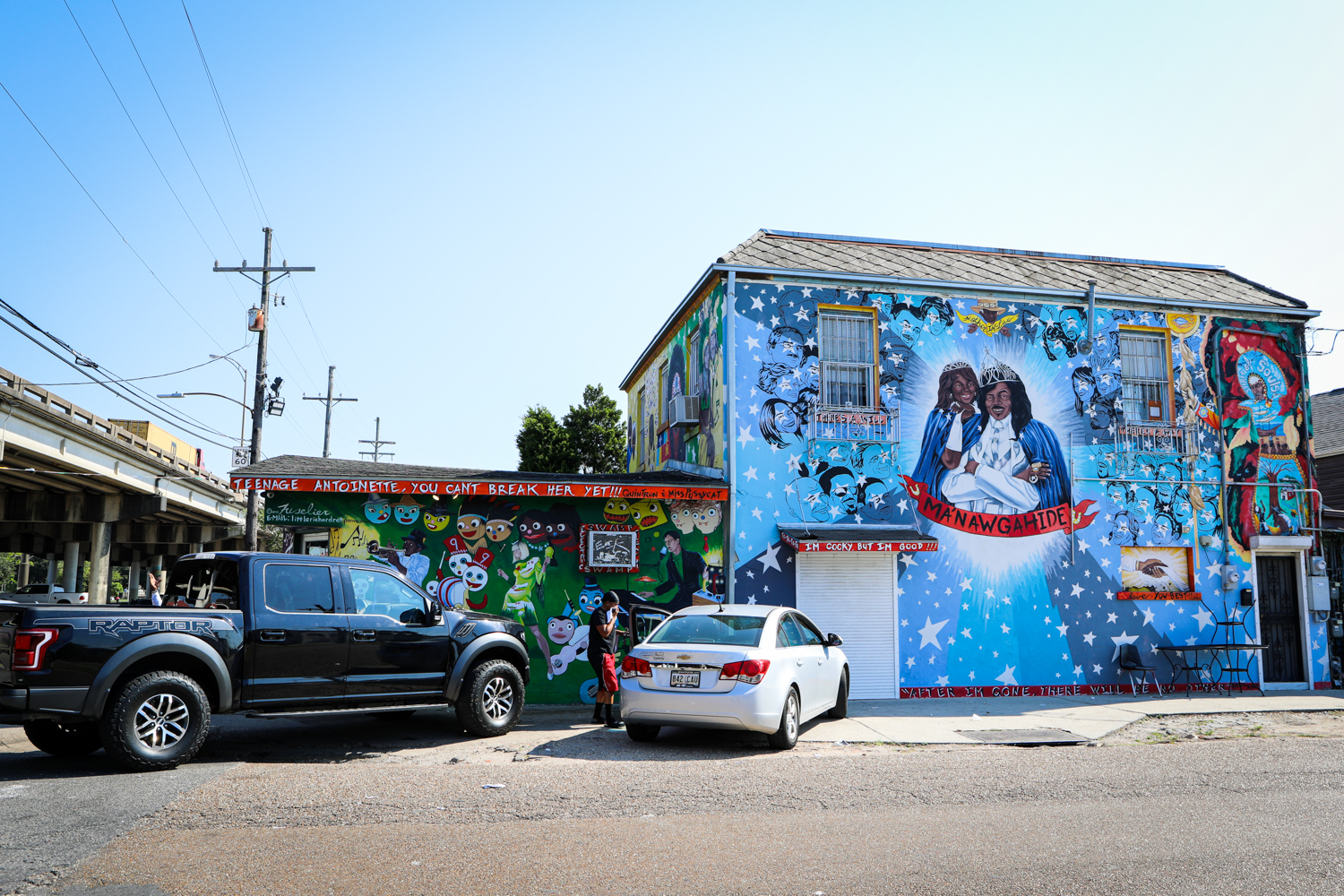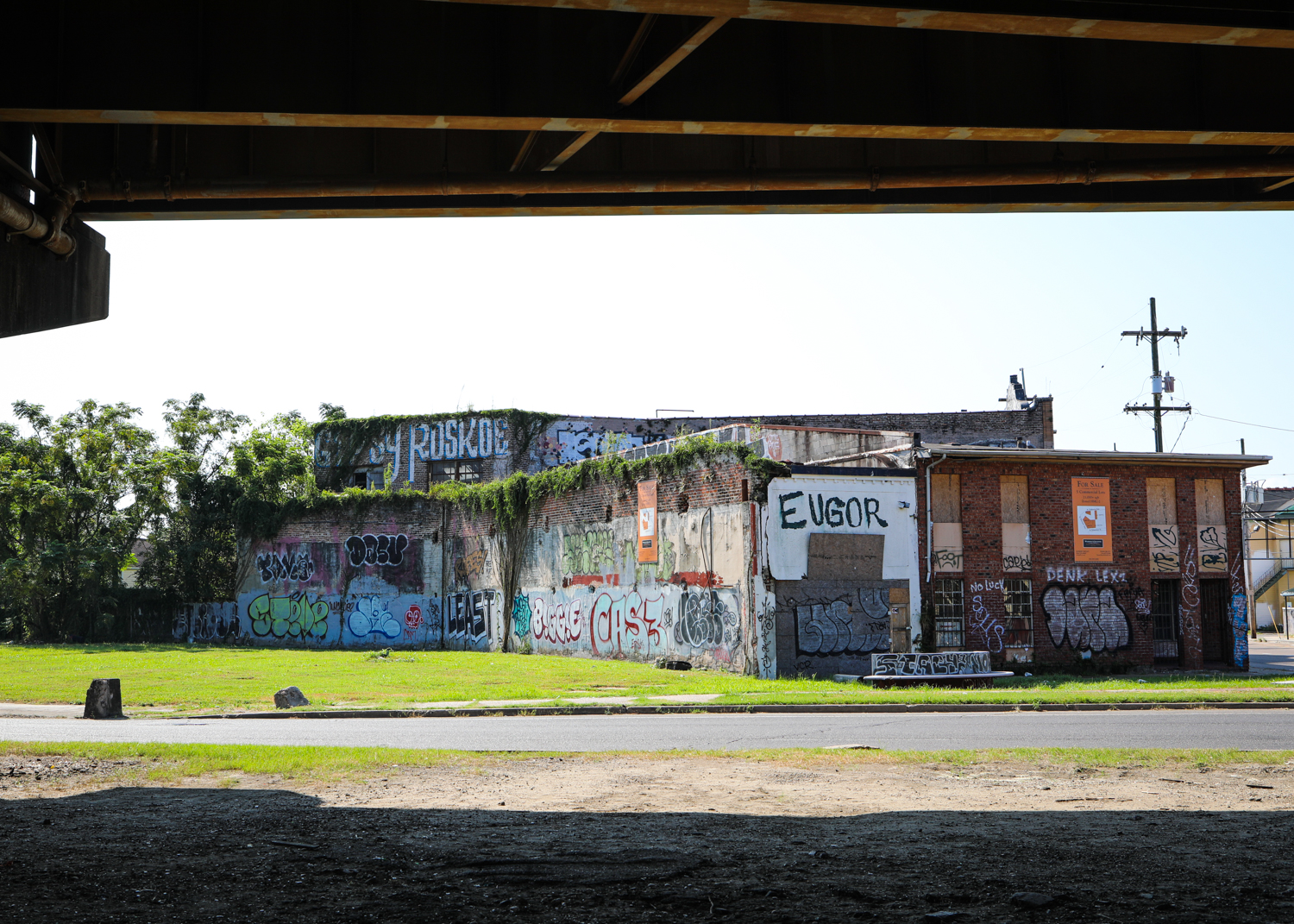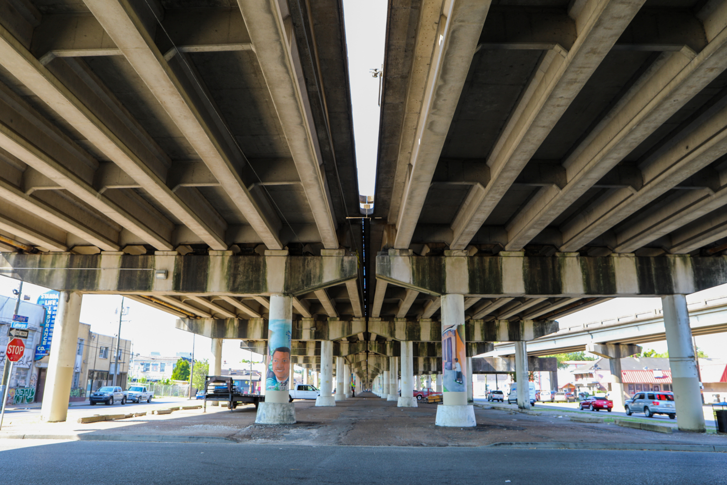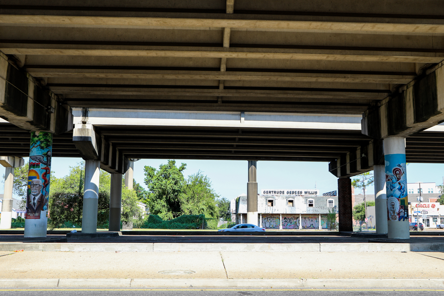 Claiborne Avenue, one of the main river-tracking thoroughfares of New Orleans, is a memorable area of the city– especially the section that runs below Interstate 10. Here you’ll find one of New Orleans’ prominent homeless tent cities, where volunteers set up meal delivery and haircut stations from time to time. Sometimes there’s a mobile clinic under there; sometimes a mobile car-washing service. On Saints game days, or after the passing of local celebrities such as Dr. John, huge crowds convene below the interstate for second line celebrations. There are as many displays of art, often honoring local historical figures, as there are blighted former residences and businesses along the corridor.