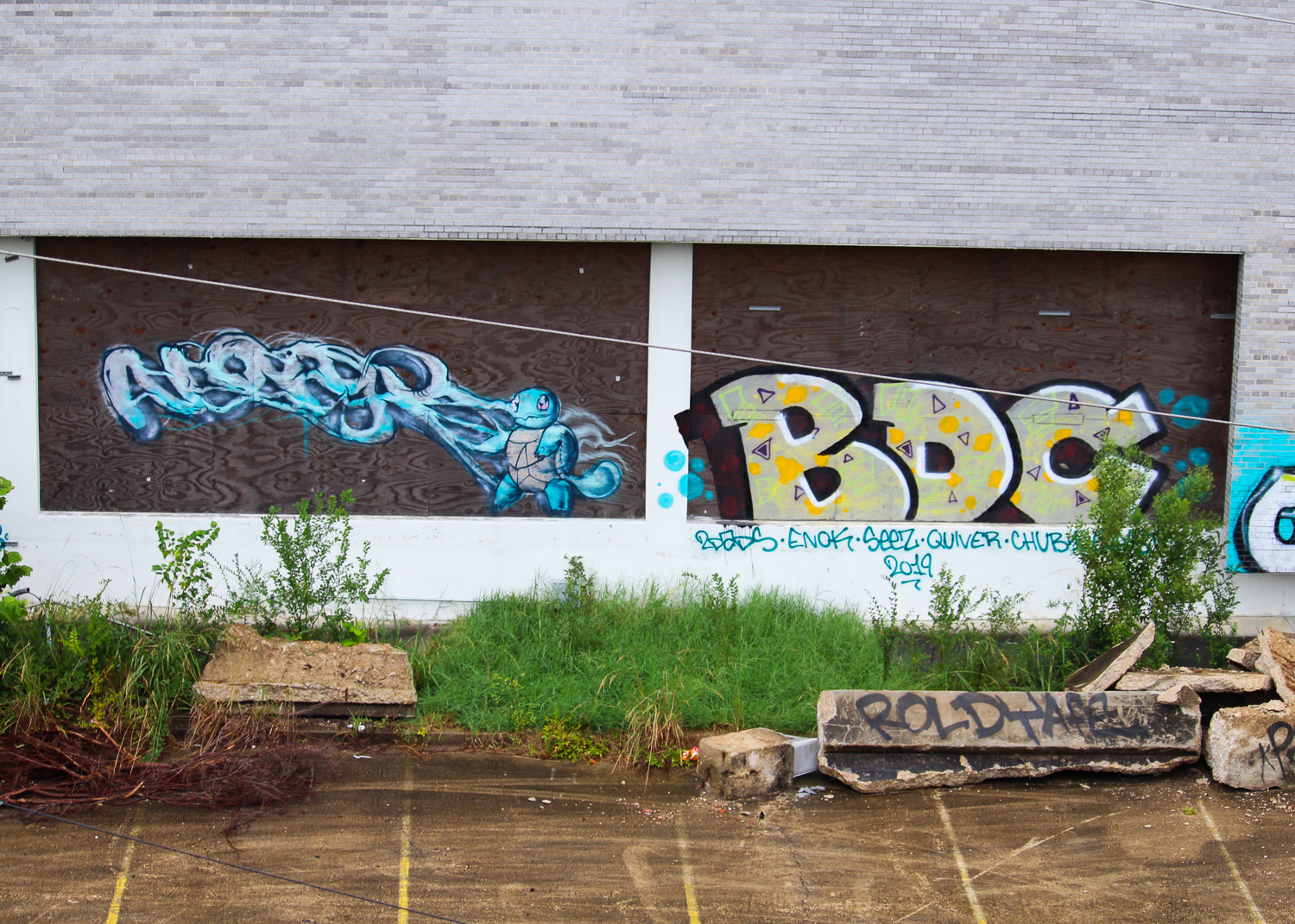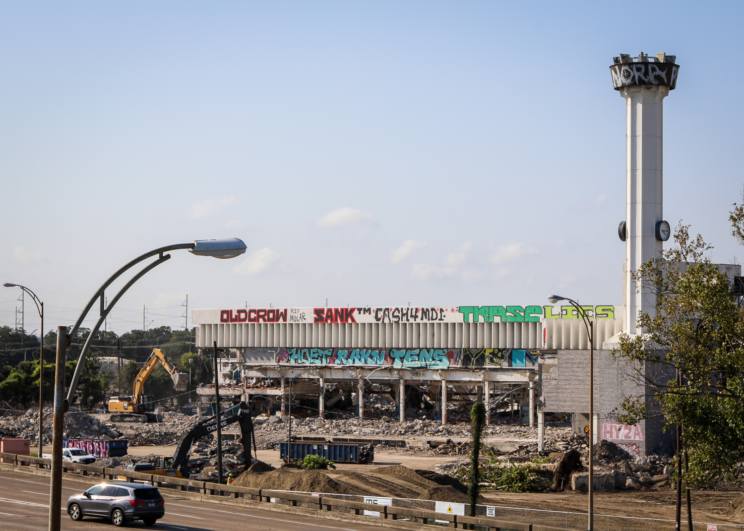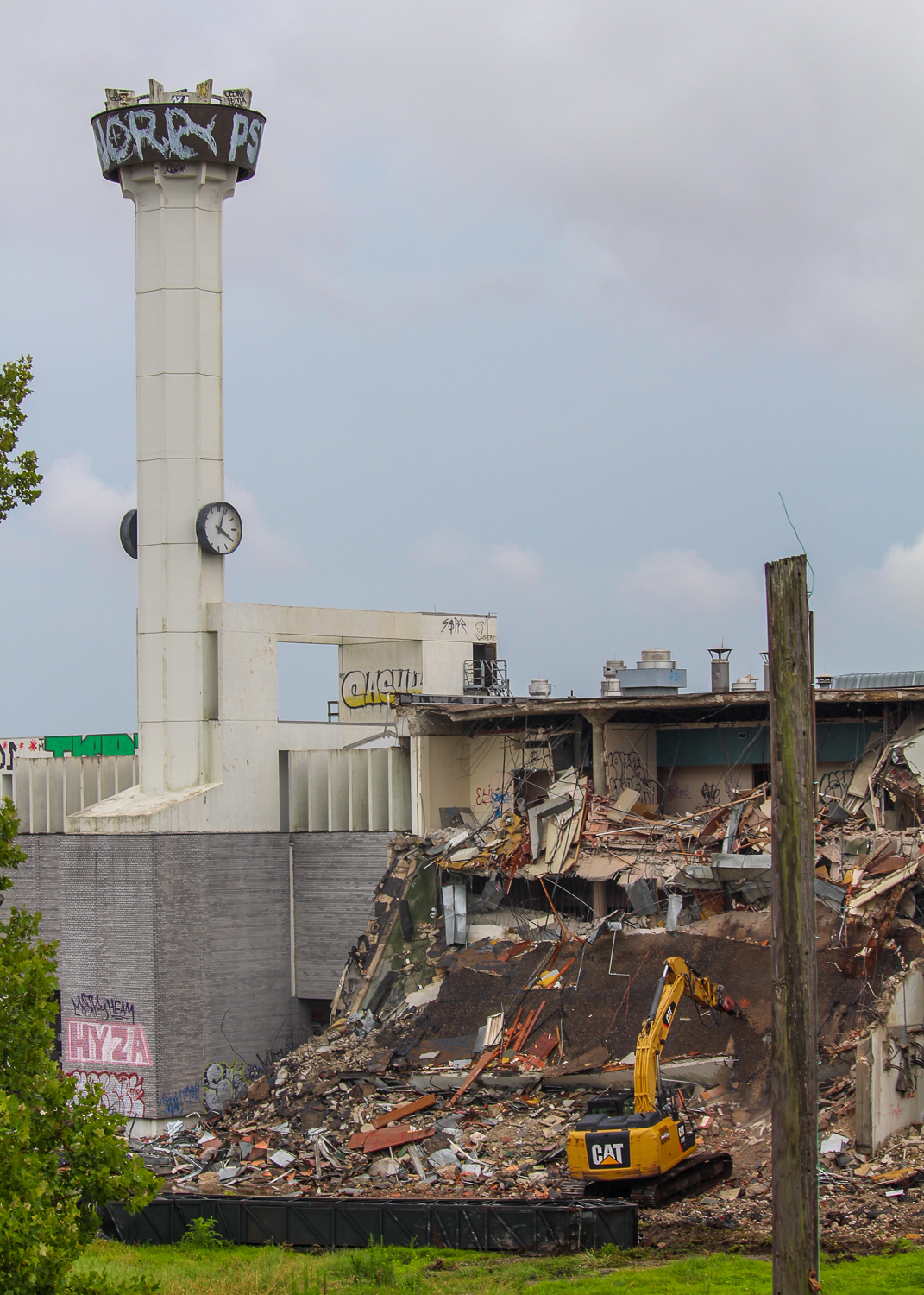 When it ceased to operate as a news center, the building became a hub for a different sort of communication as street artists slathered the walls– inside and out– with their tags and graphics. It was an eye-catching landmark that I, admittedly, took for granted the myriad times I passed it on the Pontchartrain Expressway, until I learned it was scheduled to be razed for a golf center. I took to the Broad Street bridge in June 2019 to catch some photos of the historic building’s demise: